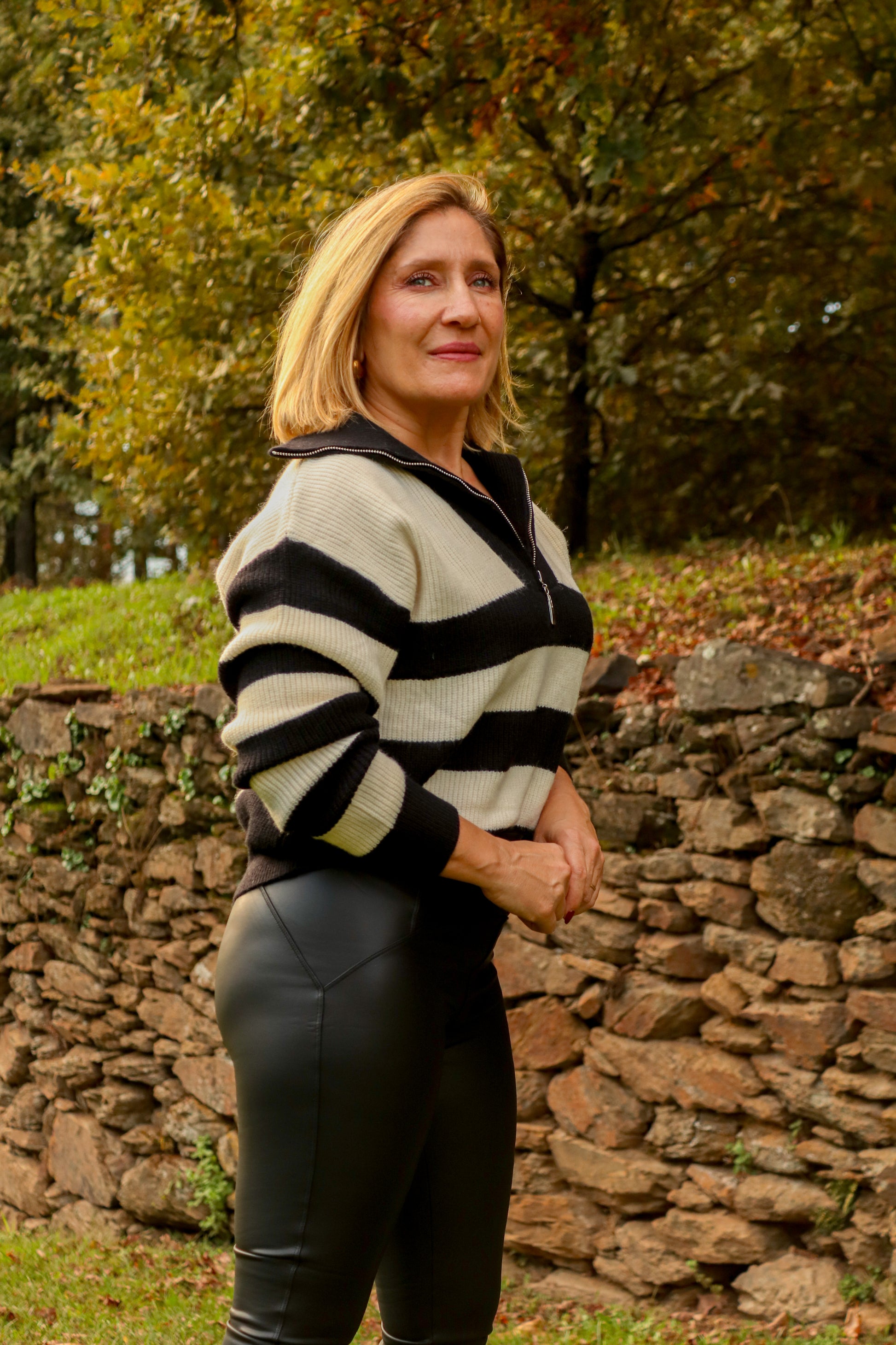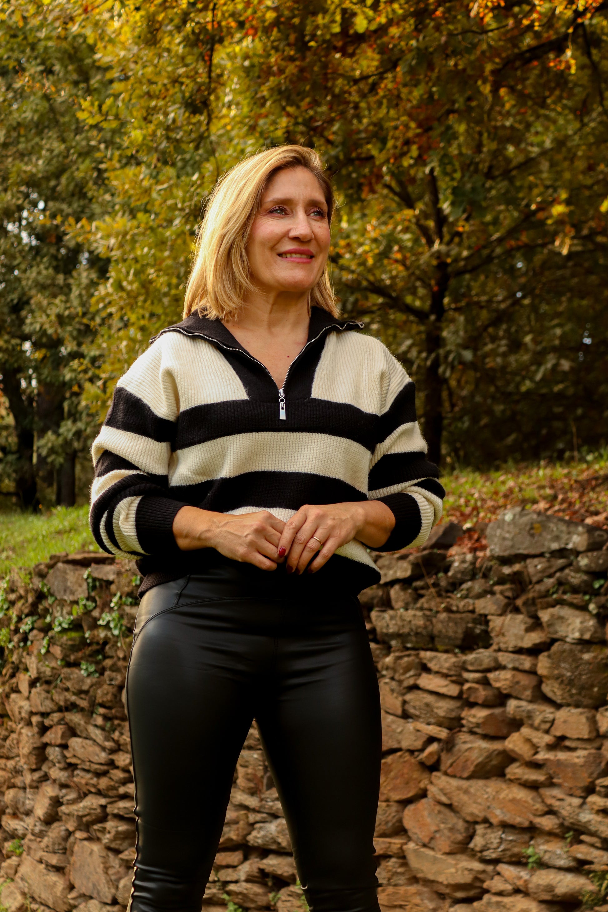Camisola de malha com riscas horizontais. Fecho na gola.