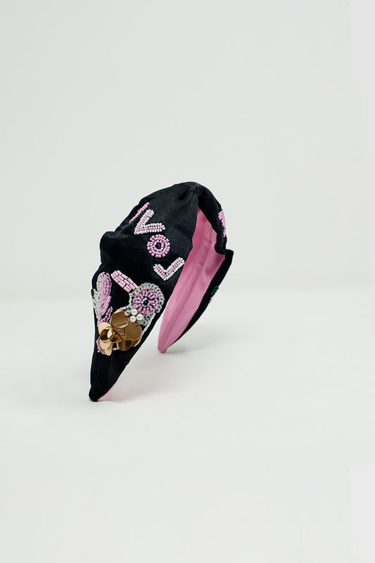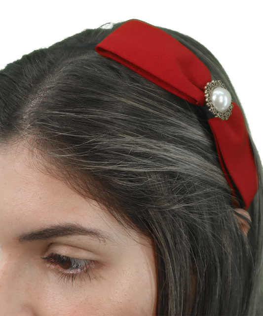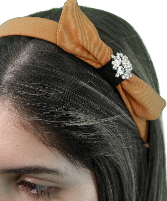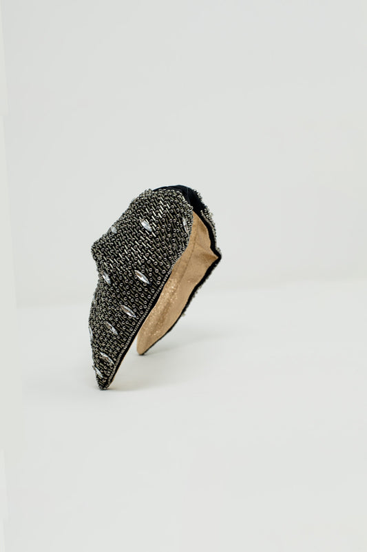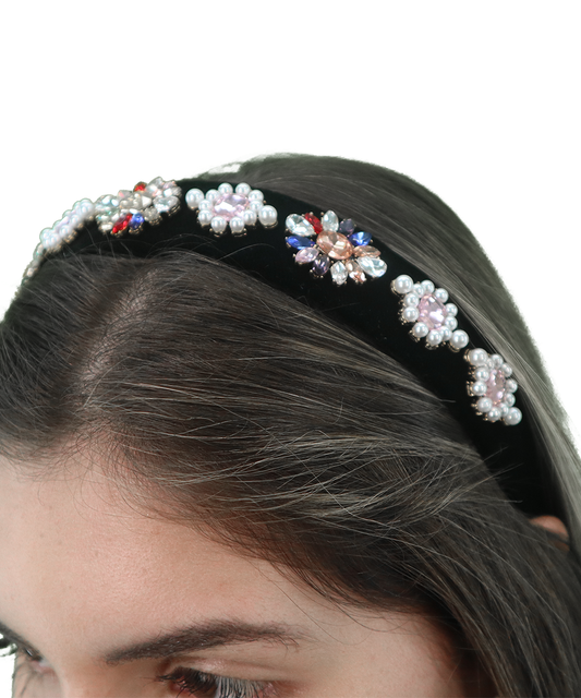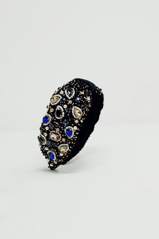 Diadema com enfeites de contas de metal e ornamentos de cristal