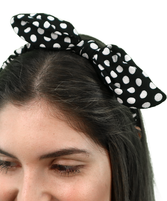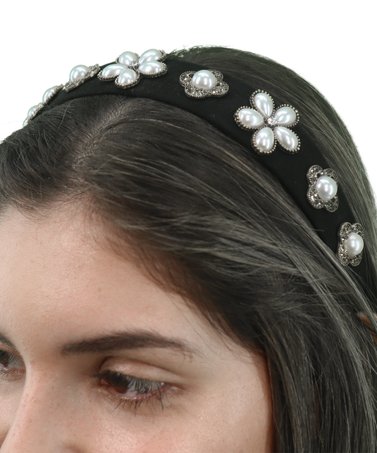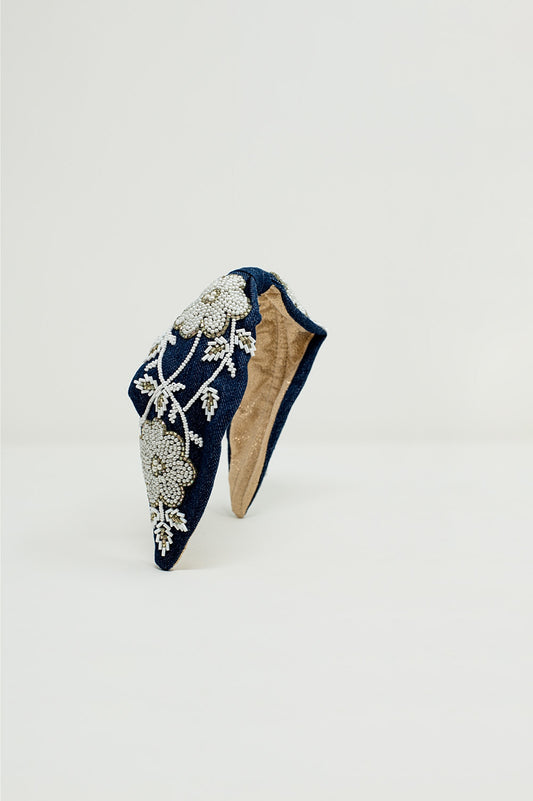 Diadema Marinho com Grandes Flores Bordadas em Branco