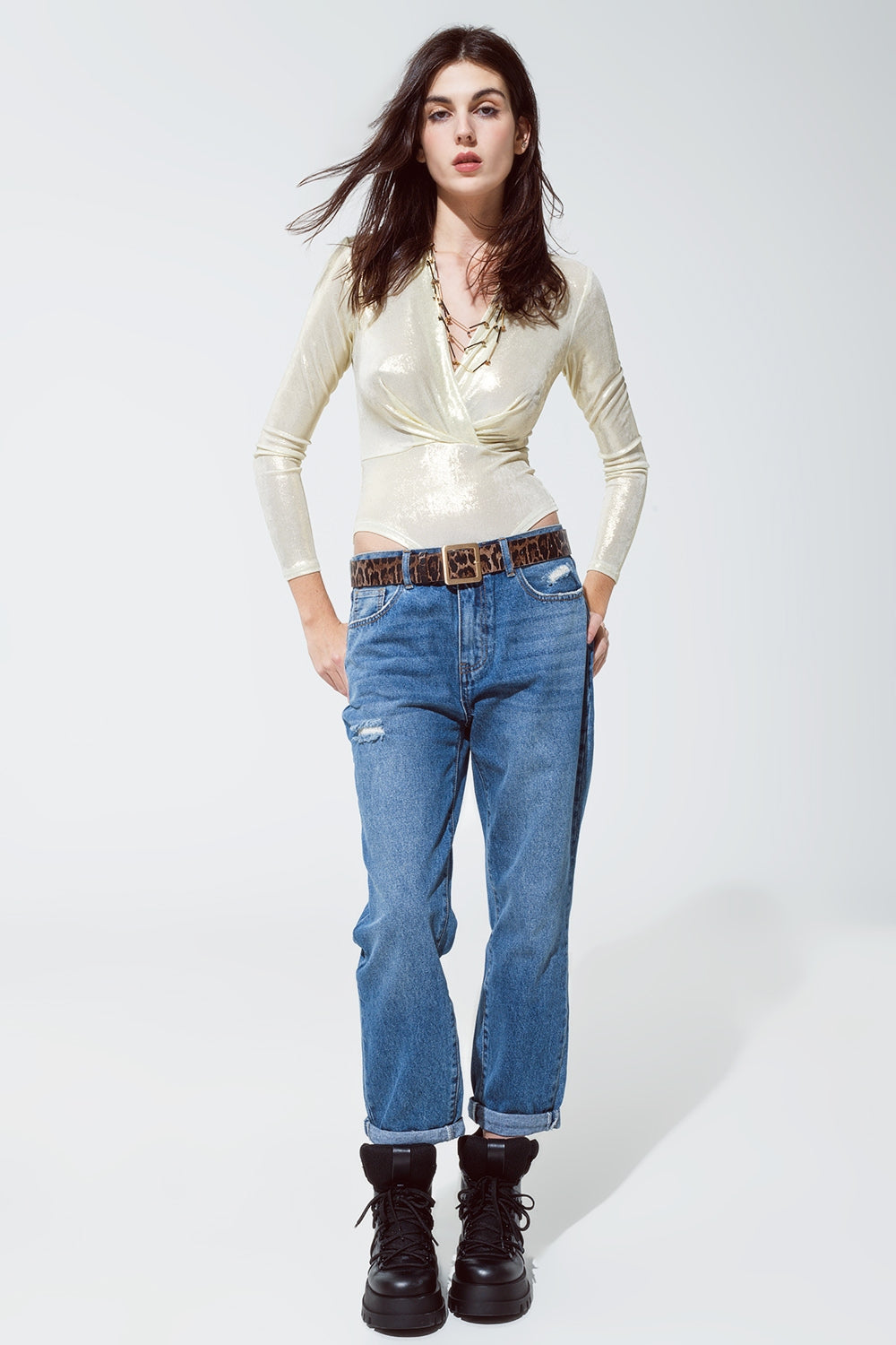 Bodysuit com acabamento metálico e pormenores drapeados em branco pérola