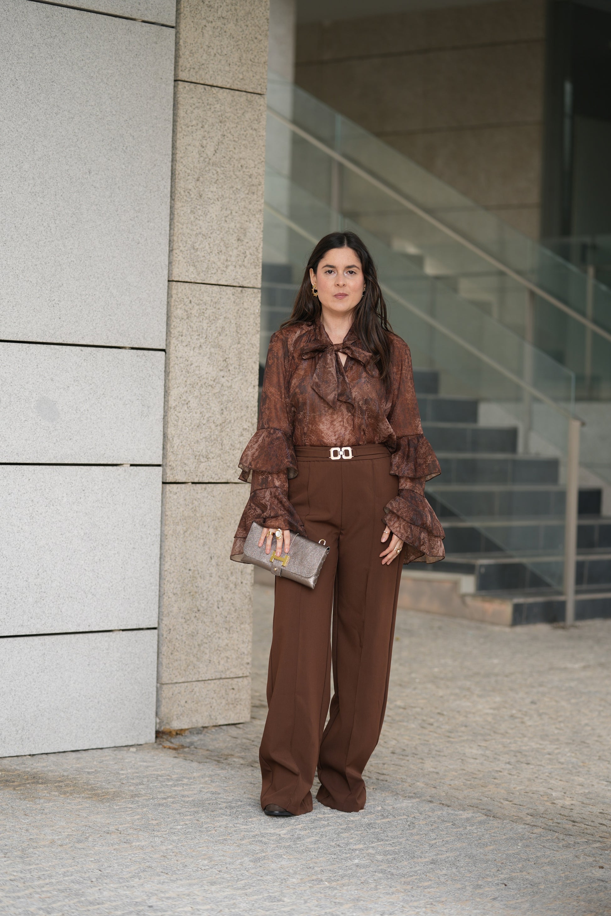 Blusa com transparência. Mangas com folhos. Decote com laço.