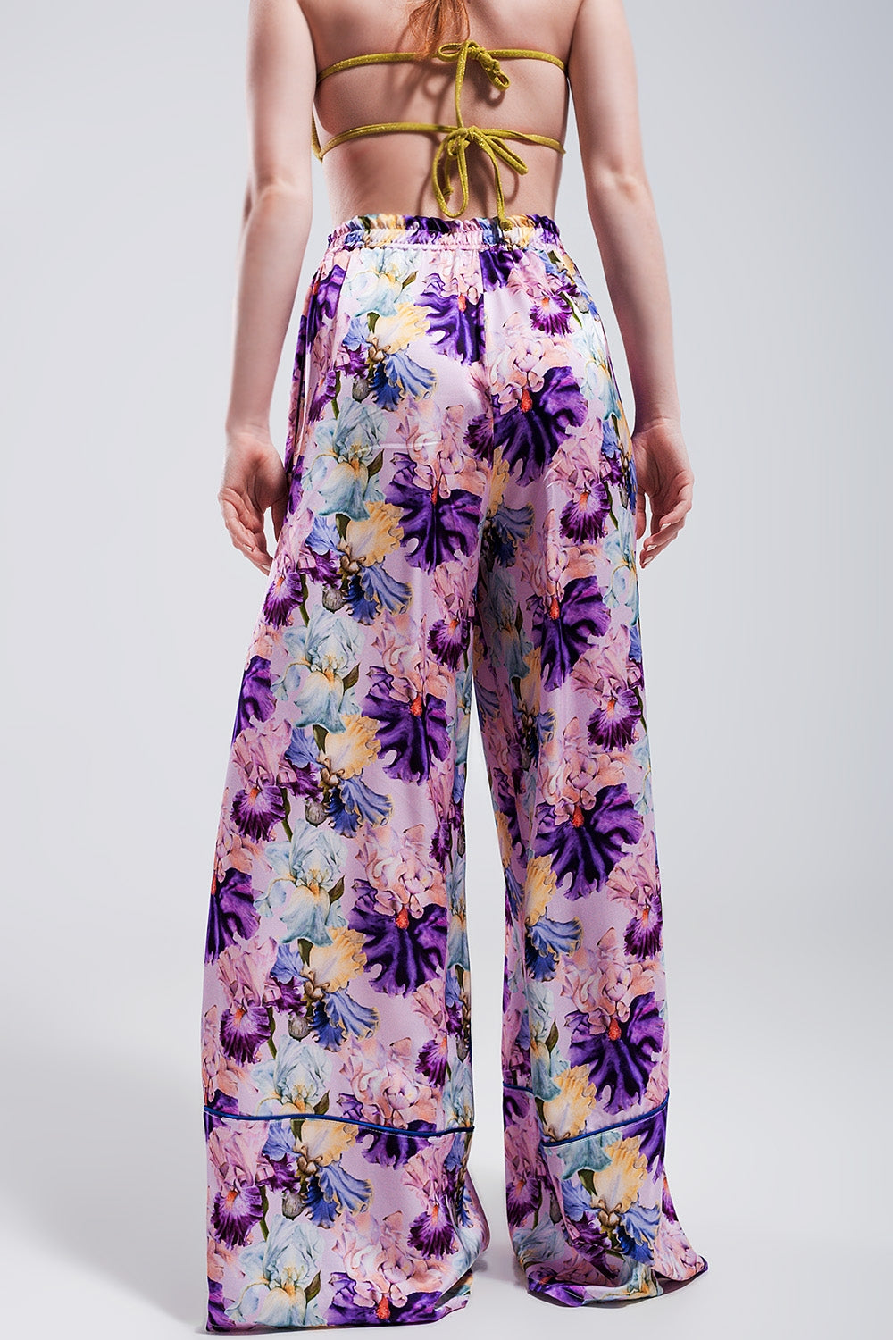 Calças de cintura larga púrpura e cintura alta em estampado floral de cetim