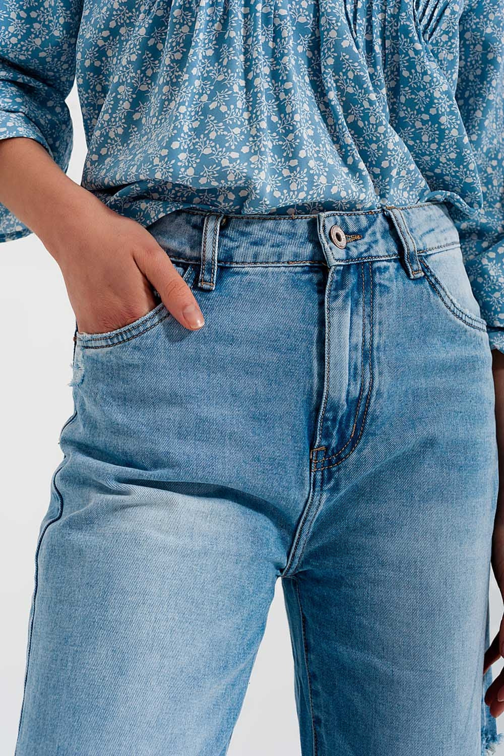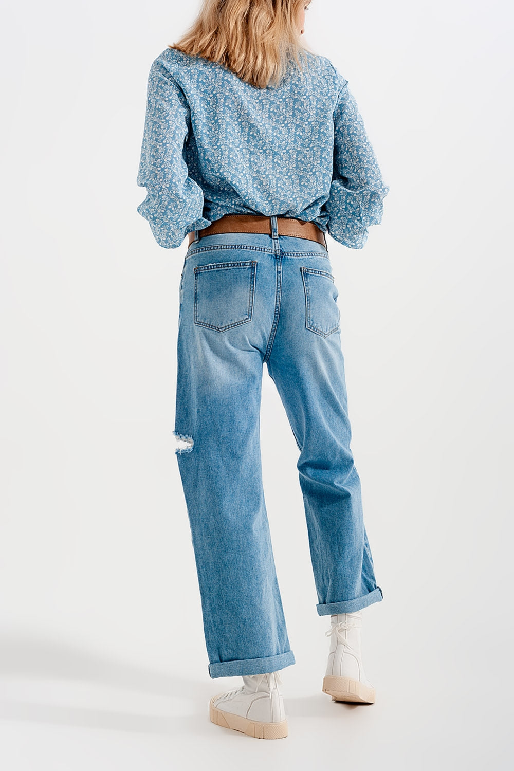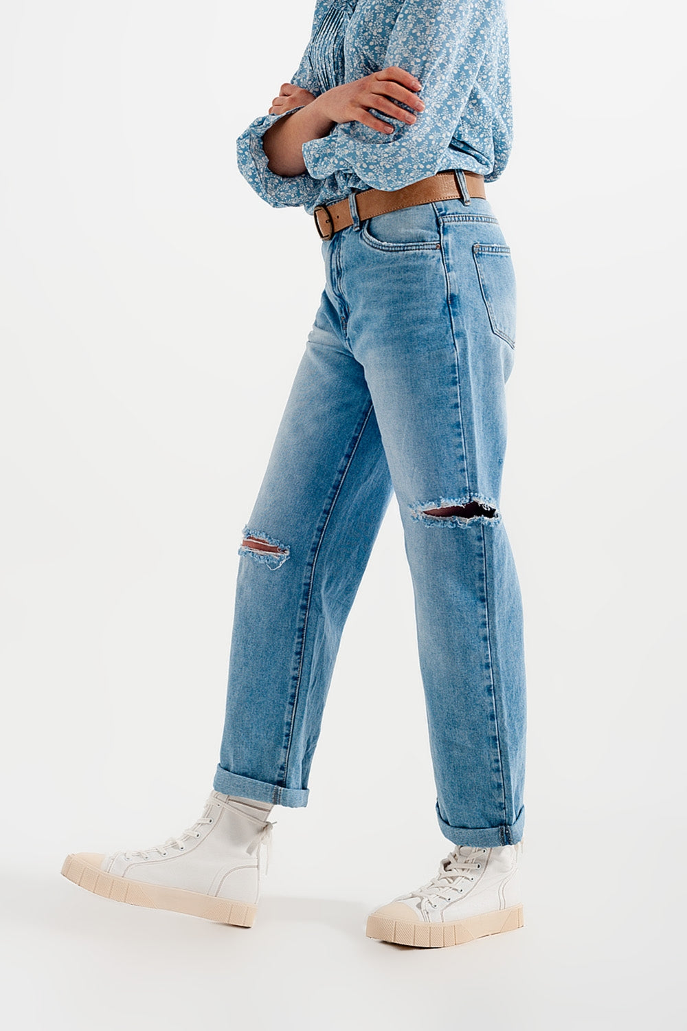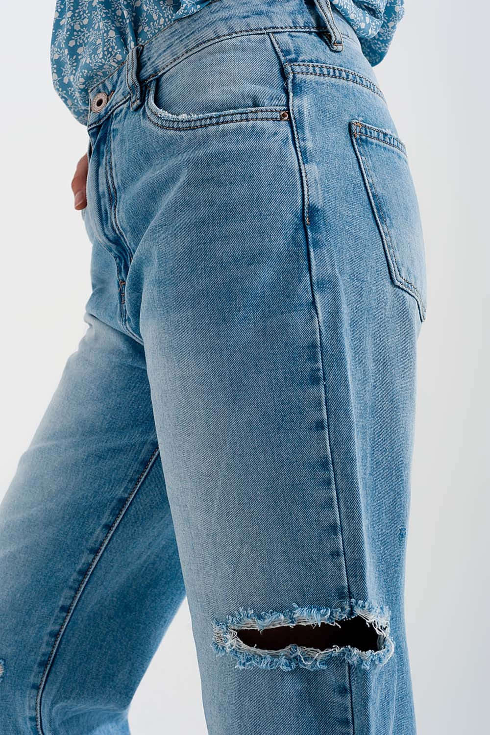Calças de ganga de perna ampla com rasgões nos joelhos em azul lavado