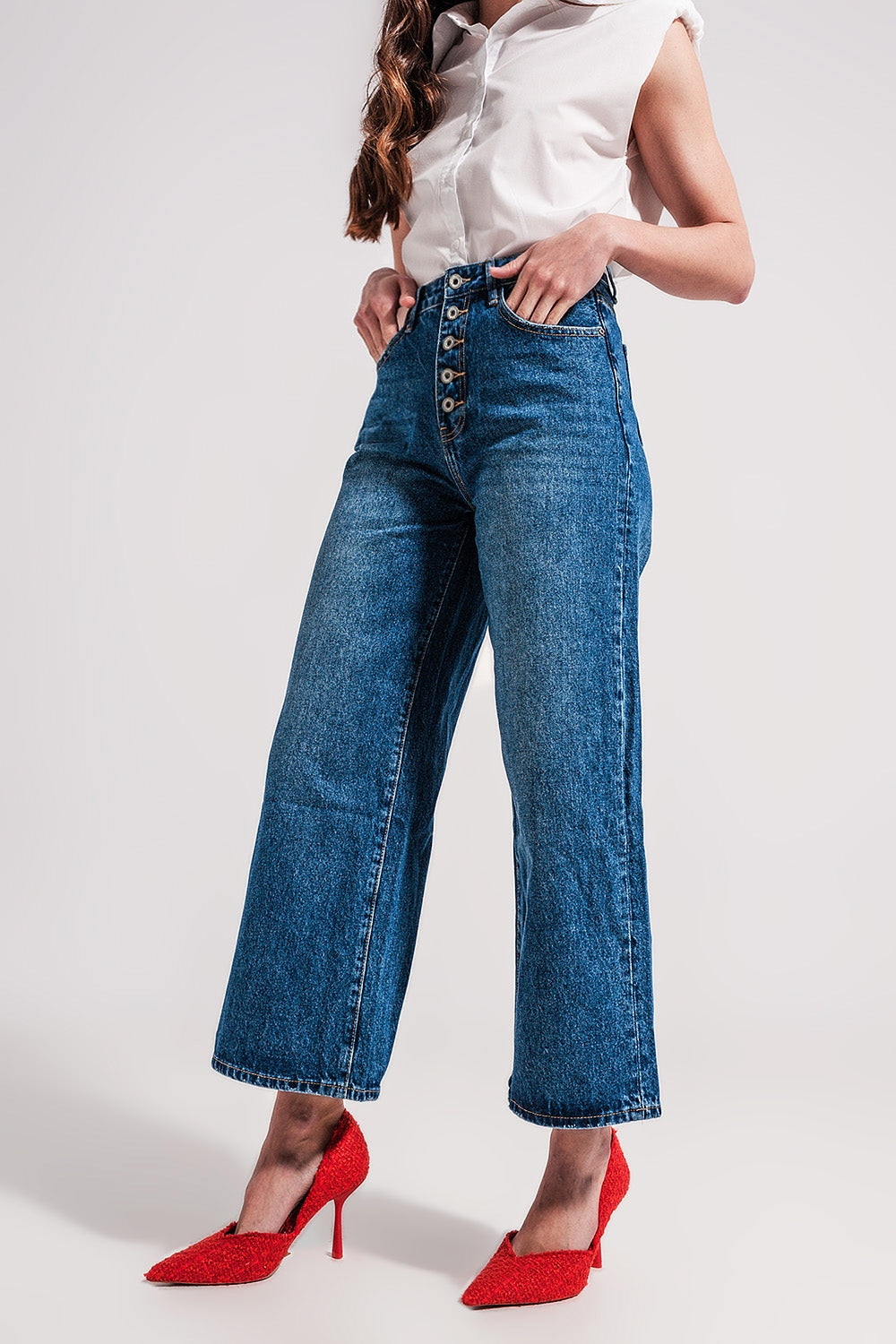 Calças de ganga de perna larga com fecho de botão exposto