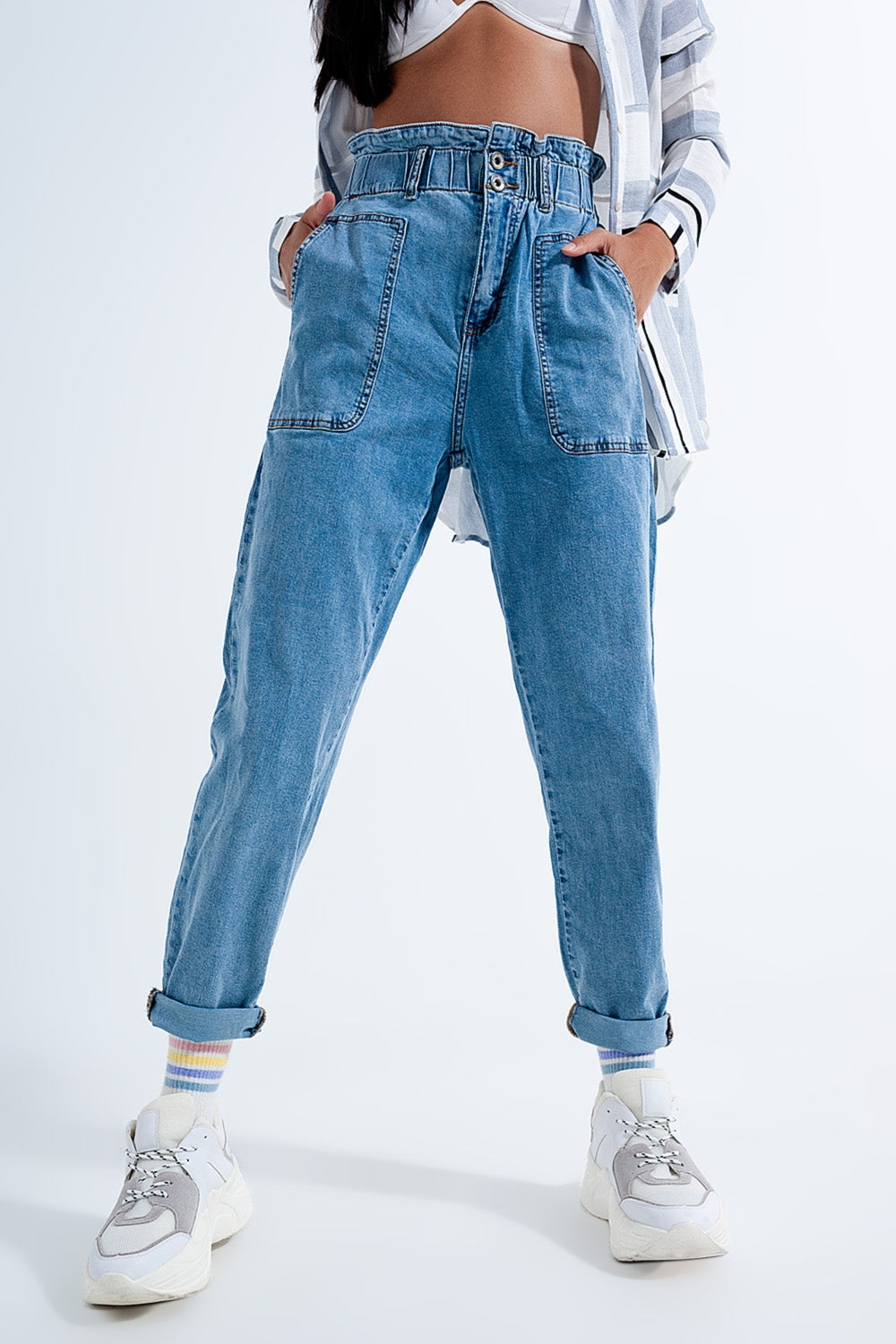 Calças de ganga Mom médias azul com cintura de saco de papel
