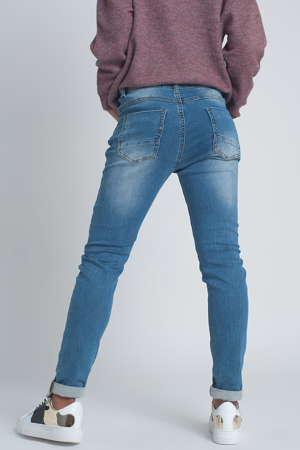 Calças de ganga rasgado em tejido fino no meio da lavagem