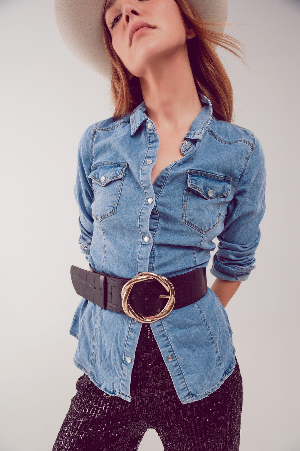 Subcategoria: Camisa . colarinho: Colarinho largo. Mangas: Mangas longas. Cortam: Ajuste padrão. estilo: Casual. Tipo calças de ganga: Basic. detalhe: Acessório não incluído. Tecido: Ganga elástica. bolsos: Bolsos de peito. Fechamento : Fecho do botão. Detalhes do produto: Bolsos funcionais. runs true to size. S.