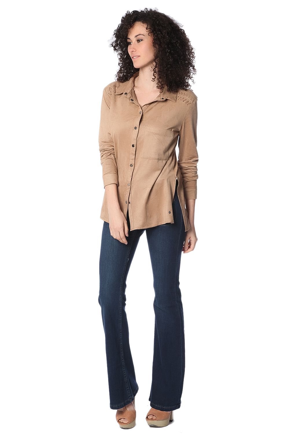 Camisa de manga longa bege com detalhe de renda-se