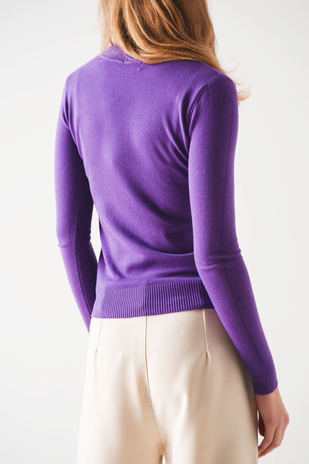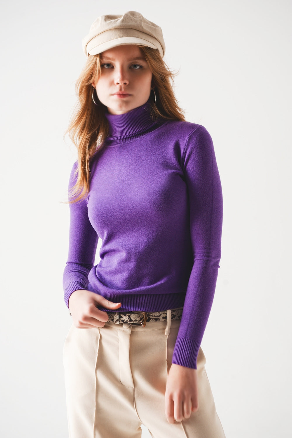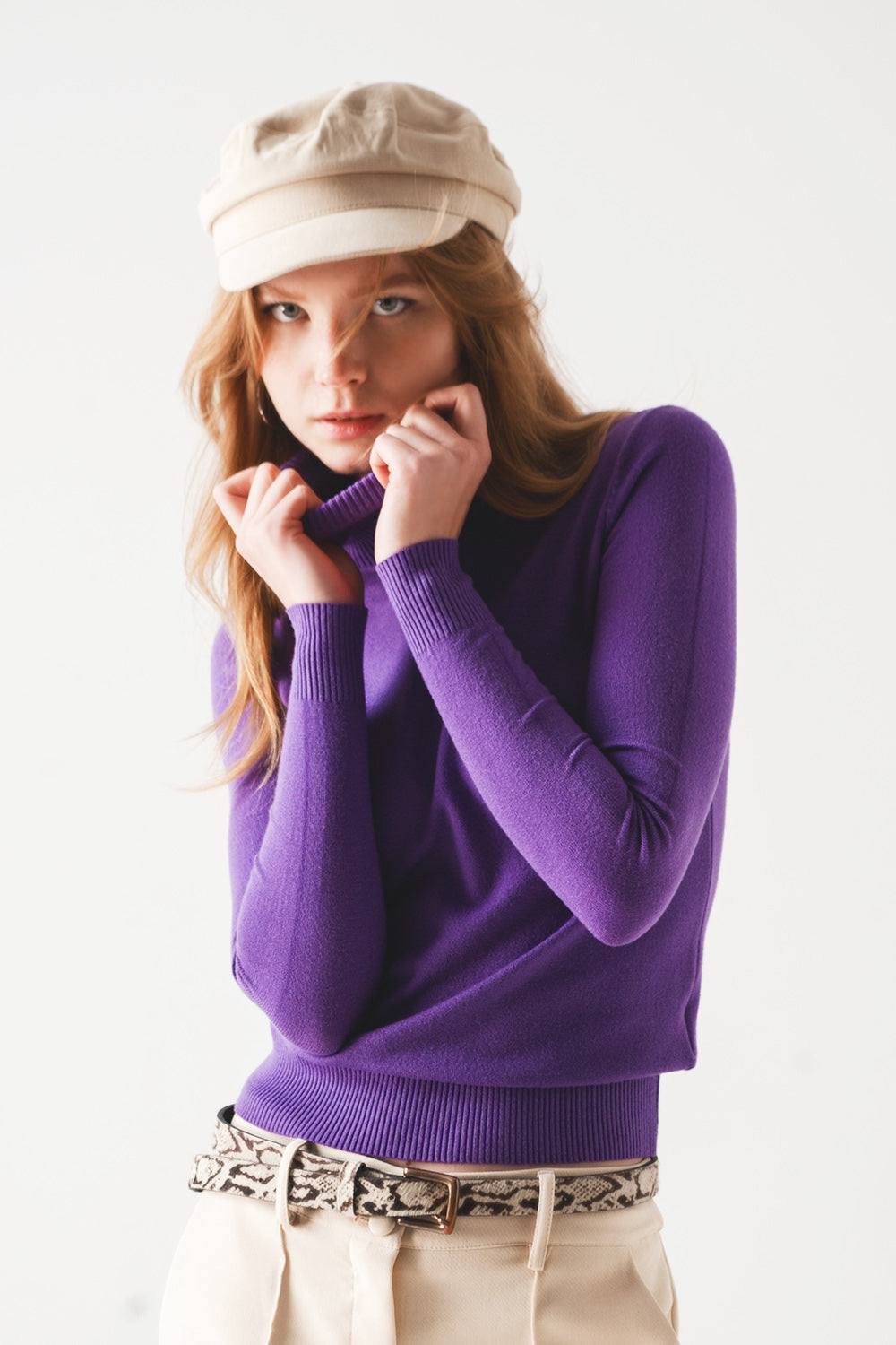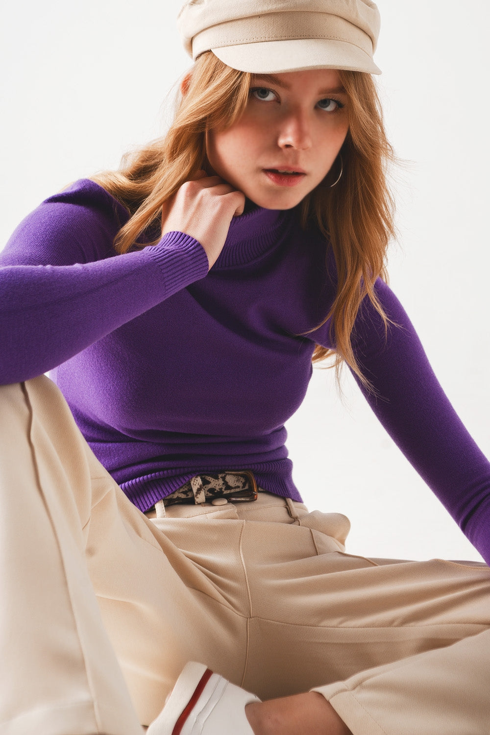 Saltador de malha fina de pescoço alto em roxo