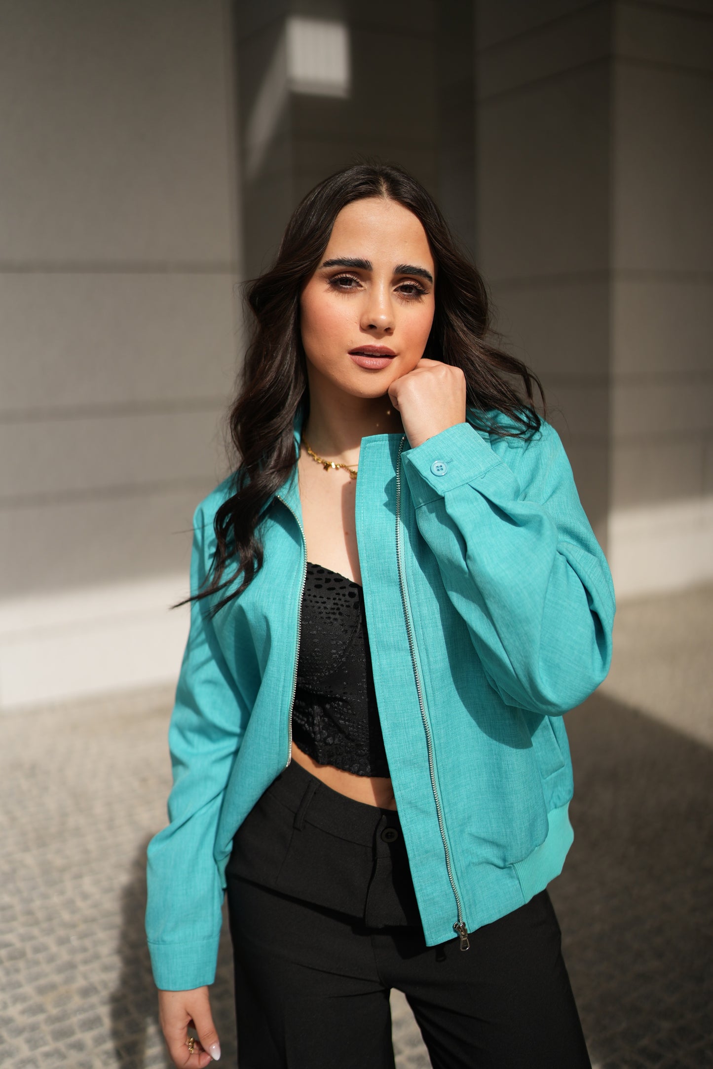 Blusão forrado com gola, manga comprida que termina com botão, fecho na frente.