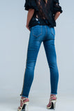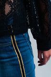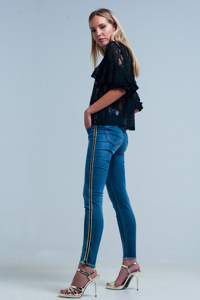 Calças de ganga azul com faixa lateral dourada e preta