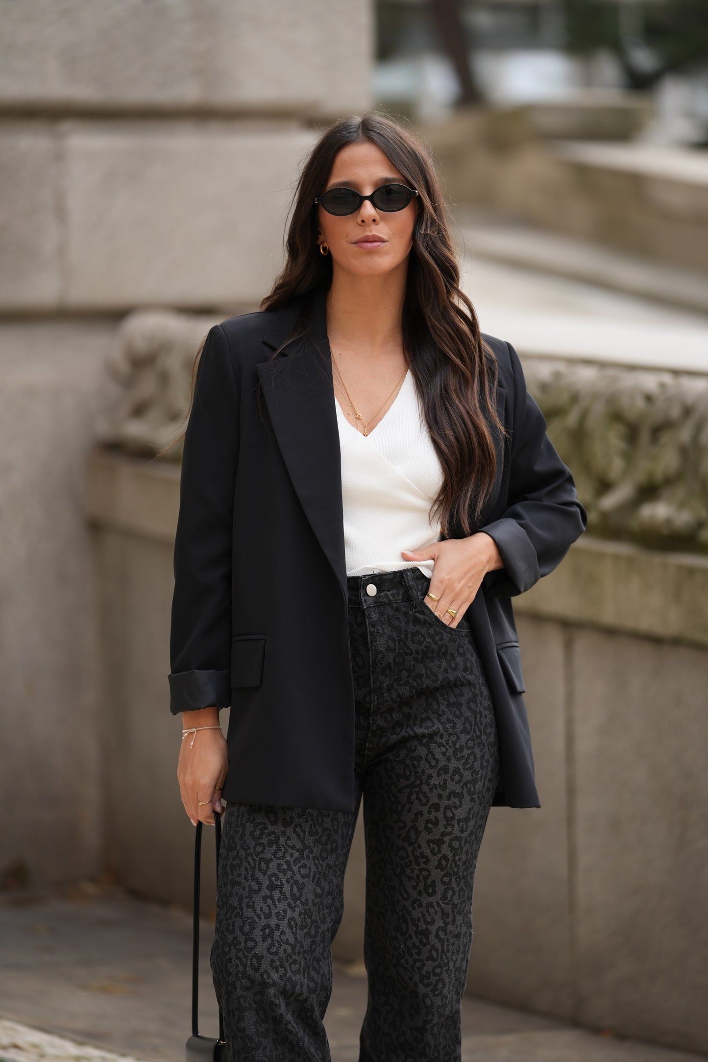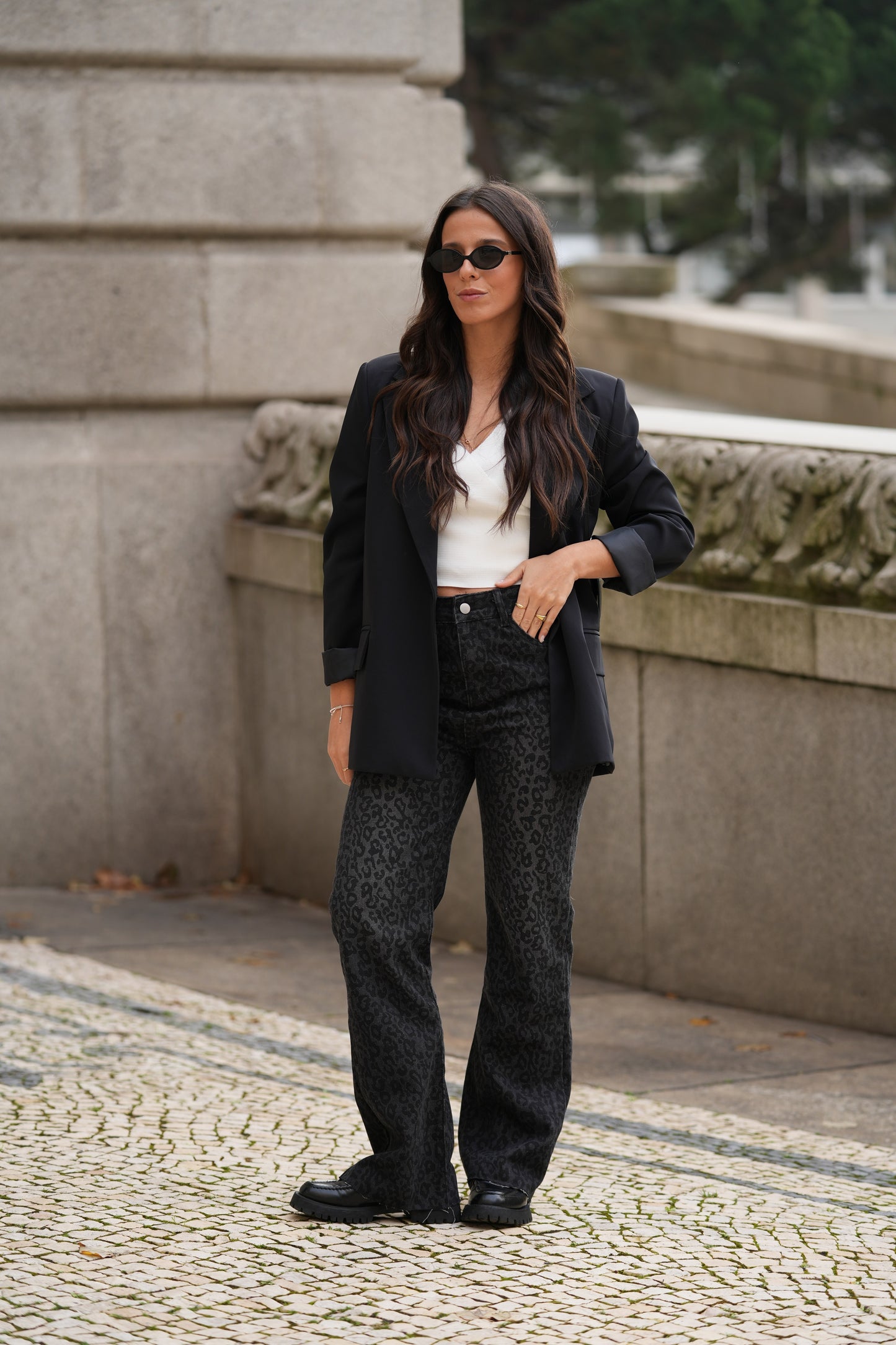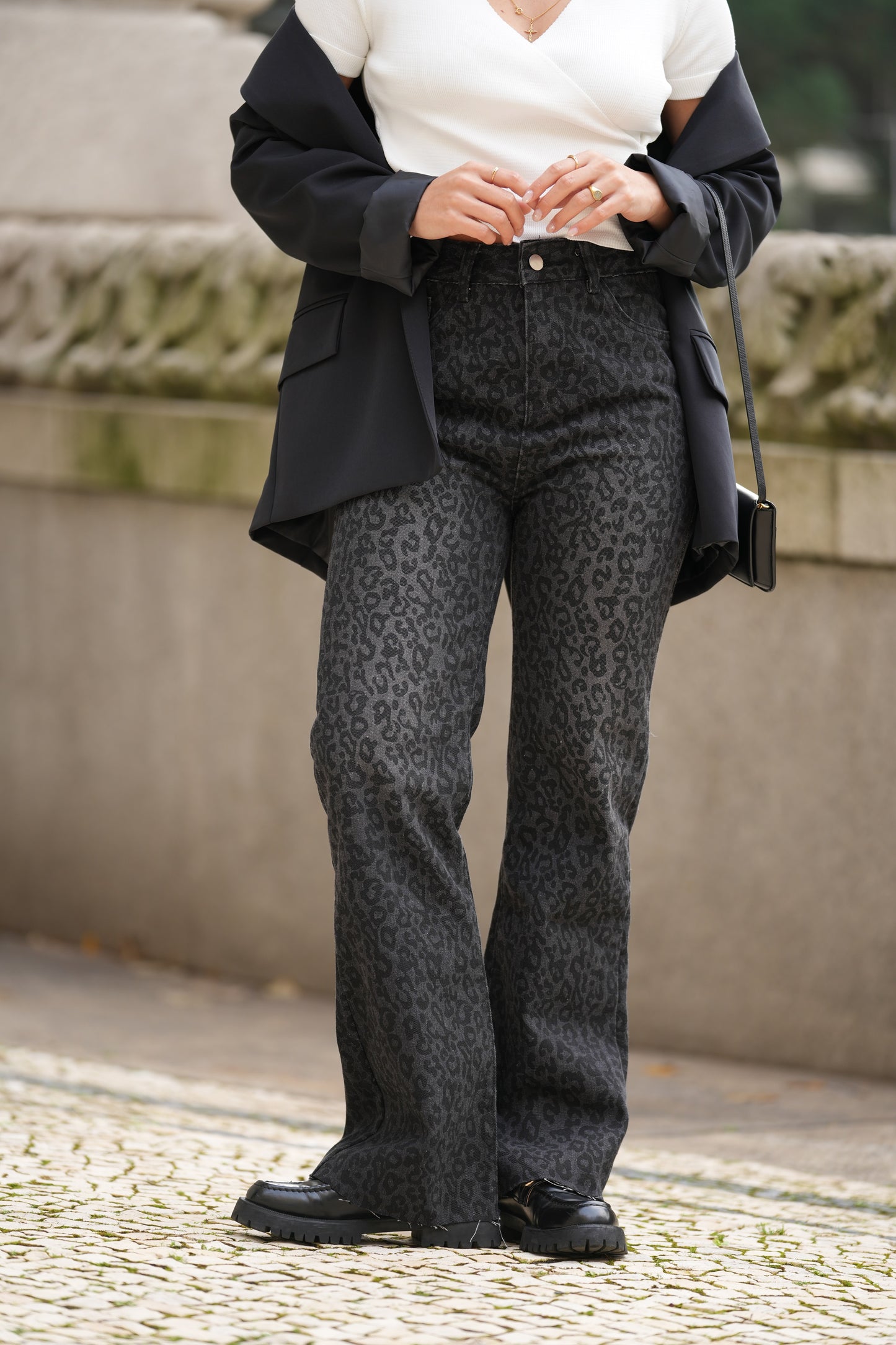 Calça de ganga wide leg, estampa leopardo, tons preto e cinza.