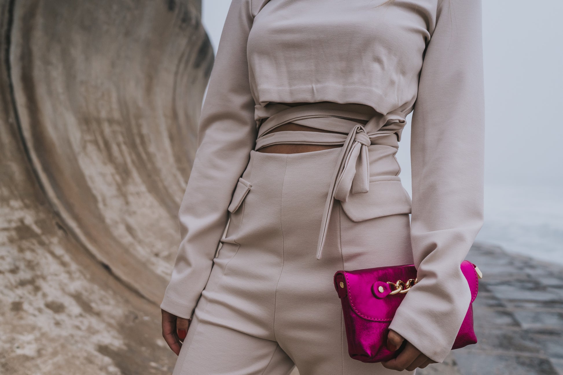 Calça bege pantalona. Fecho invisível atrás.