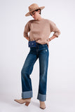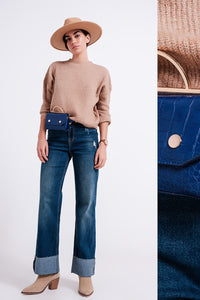 Calças de ganga azuis de cintura alta com bainhas viradas para cima