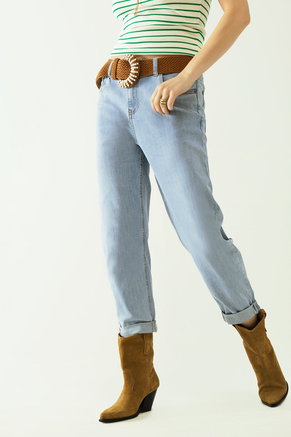 Calças de ganga azul-claras para namorados com pormenores de costura nas extremidades
