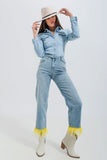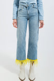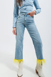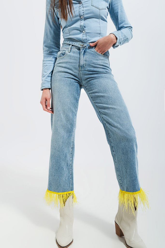 Calças de ganga com pernas direitas e penas artificiais amarelas ao longo da bainha
