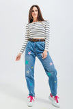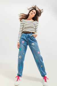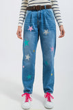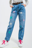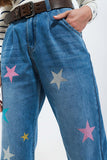 Calças de ganga de cintura alta com frente plissada e estampada em estrela