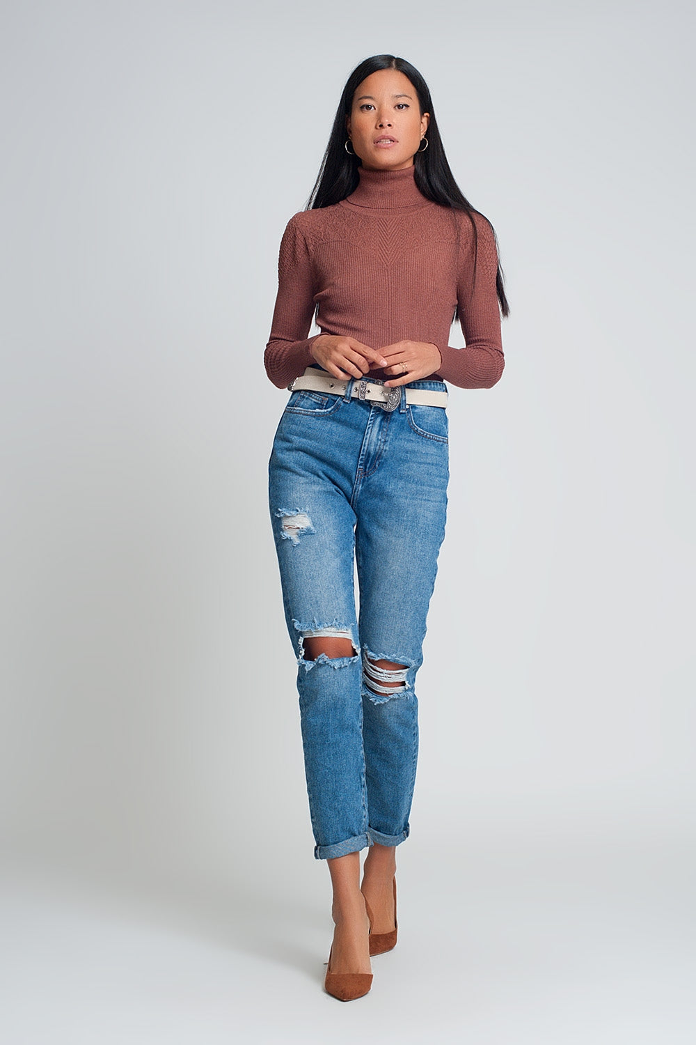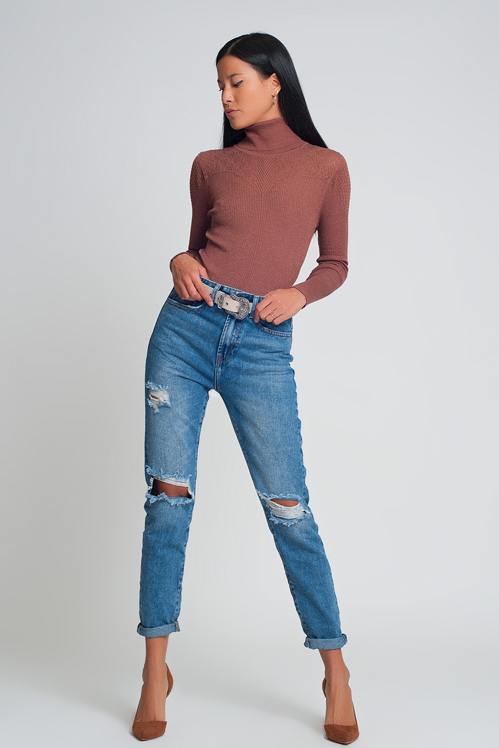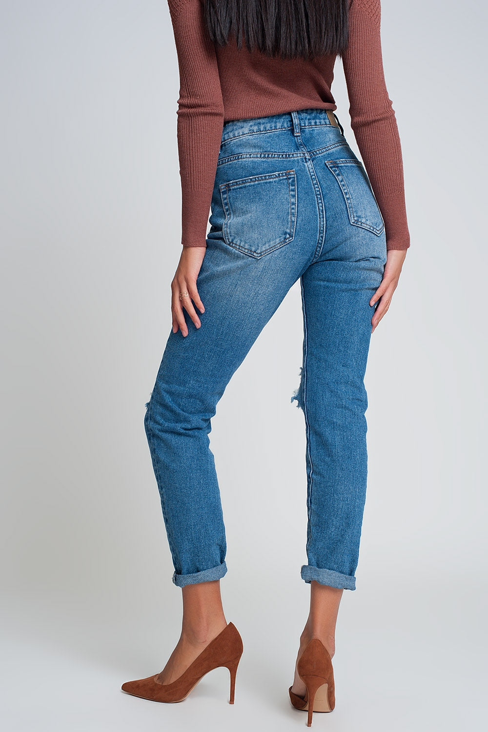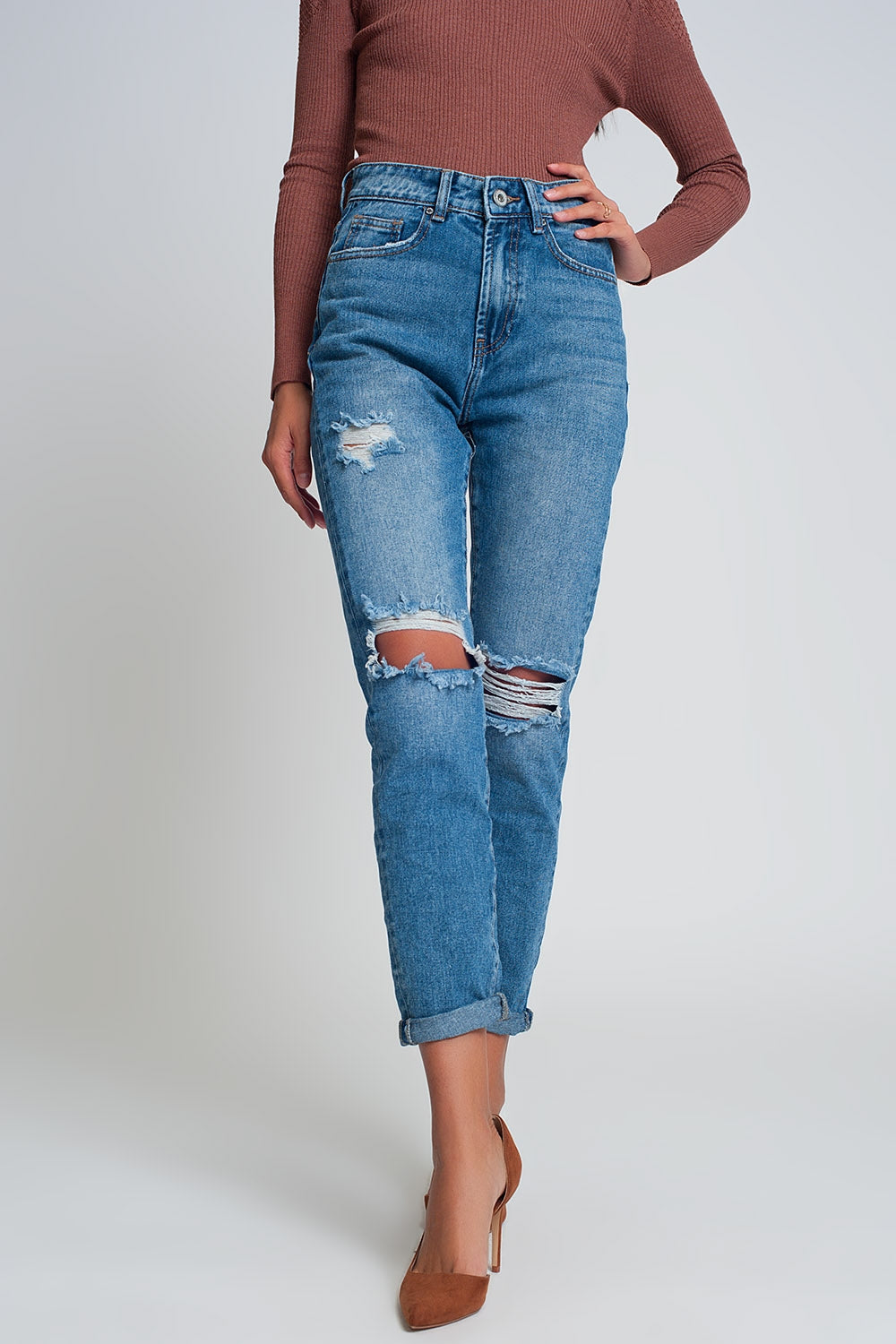Calças de ganga de cintura alta com joelhos rasgados em azul escuro