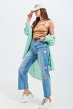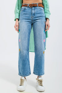 Calças de ganga de cintura alta e perna direita com impressão de coração no meio da lavagem