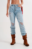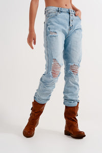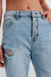 Calças de ganga de perna direita azul clara rasgada com detalhe de botão e rasga