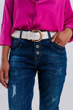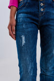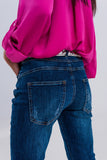 Calças de ganga de perna direita com botões visíveis em azul escuro