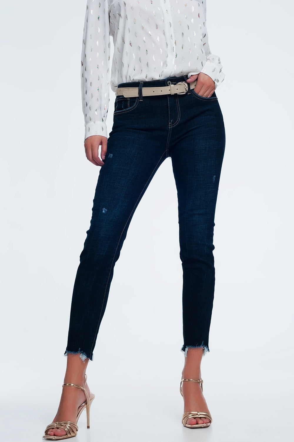calças de ganga em azul brilhante com bainha cru