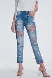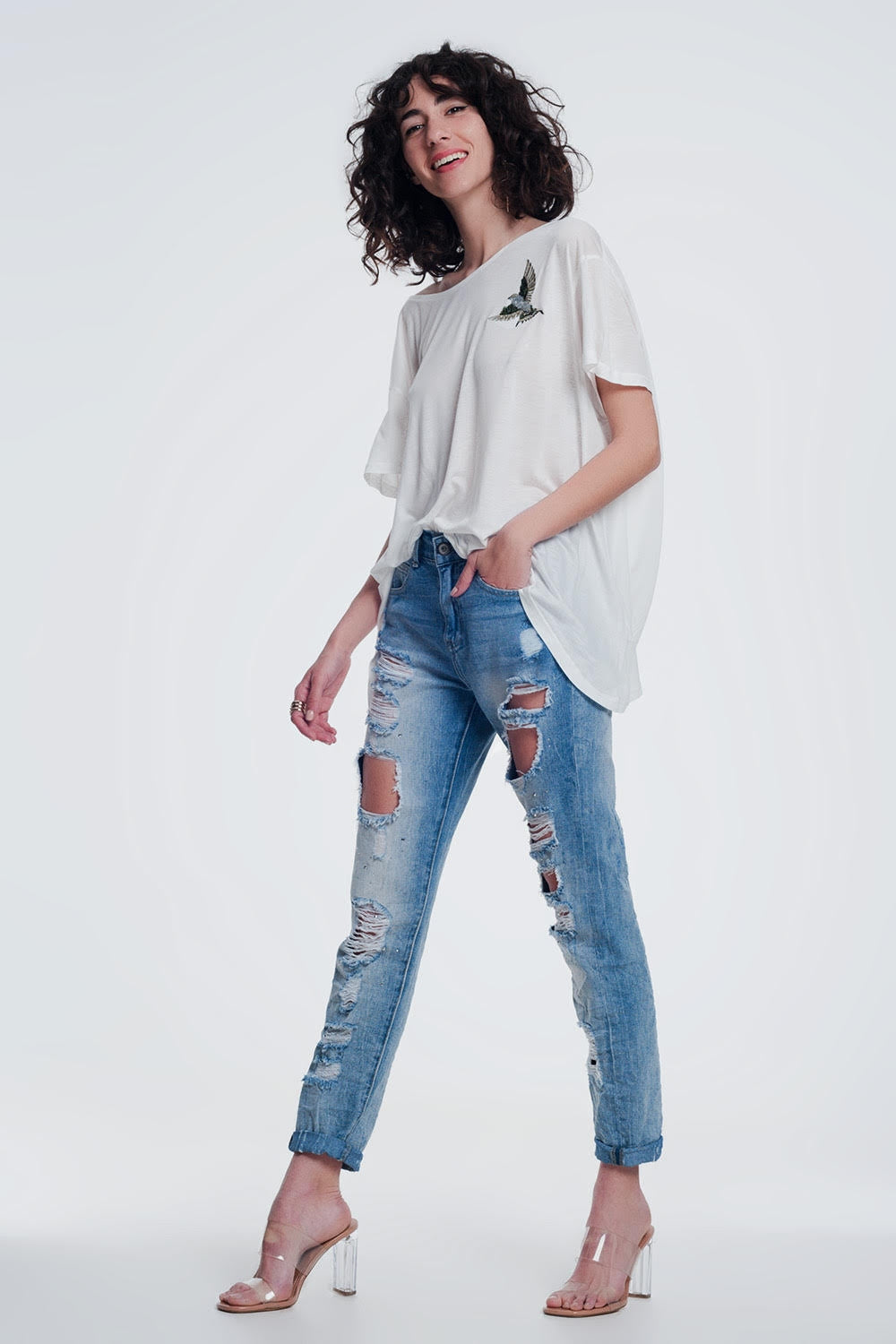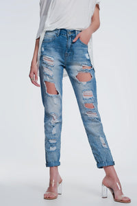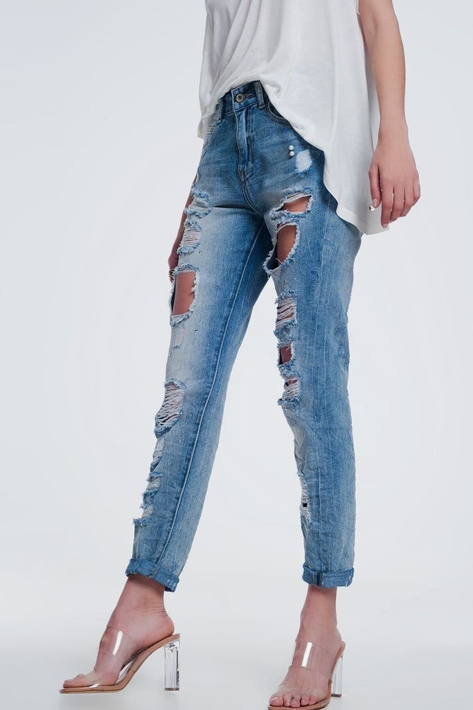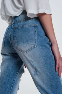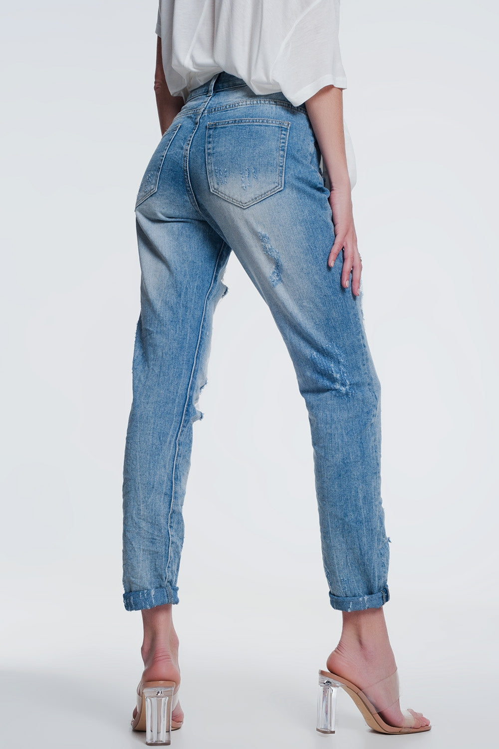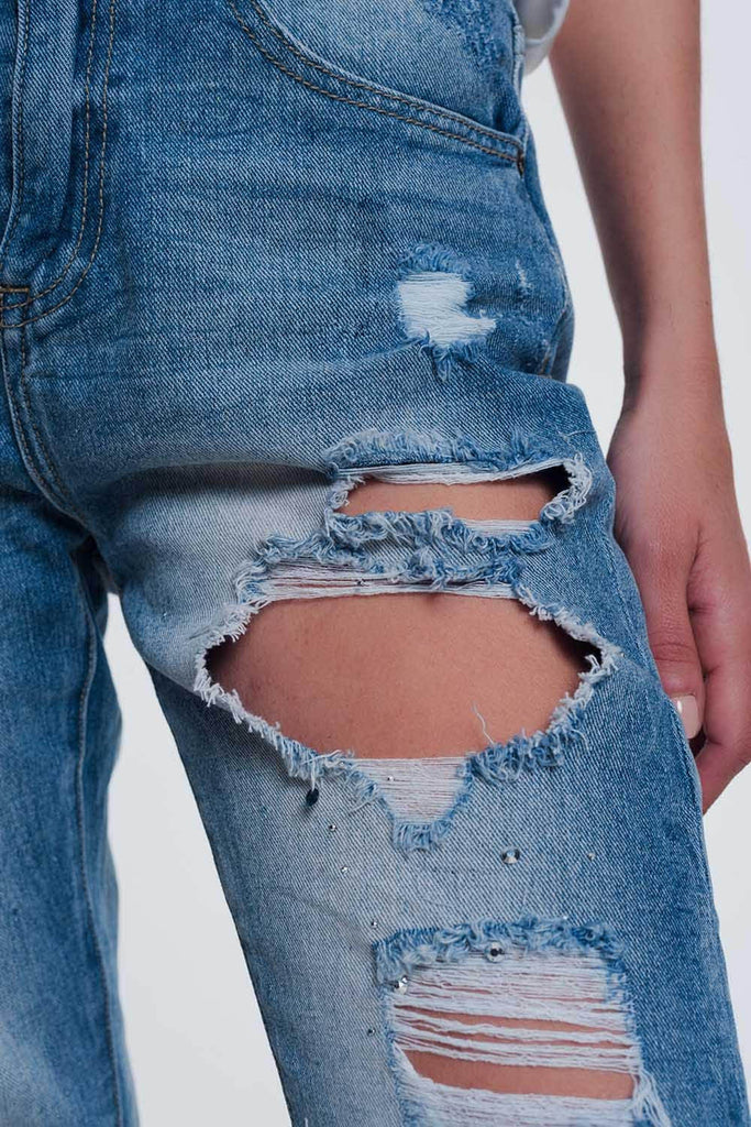 calças de ganga rasgado azul claro com perna reta e arranha-céus