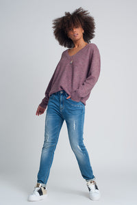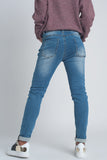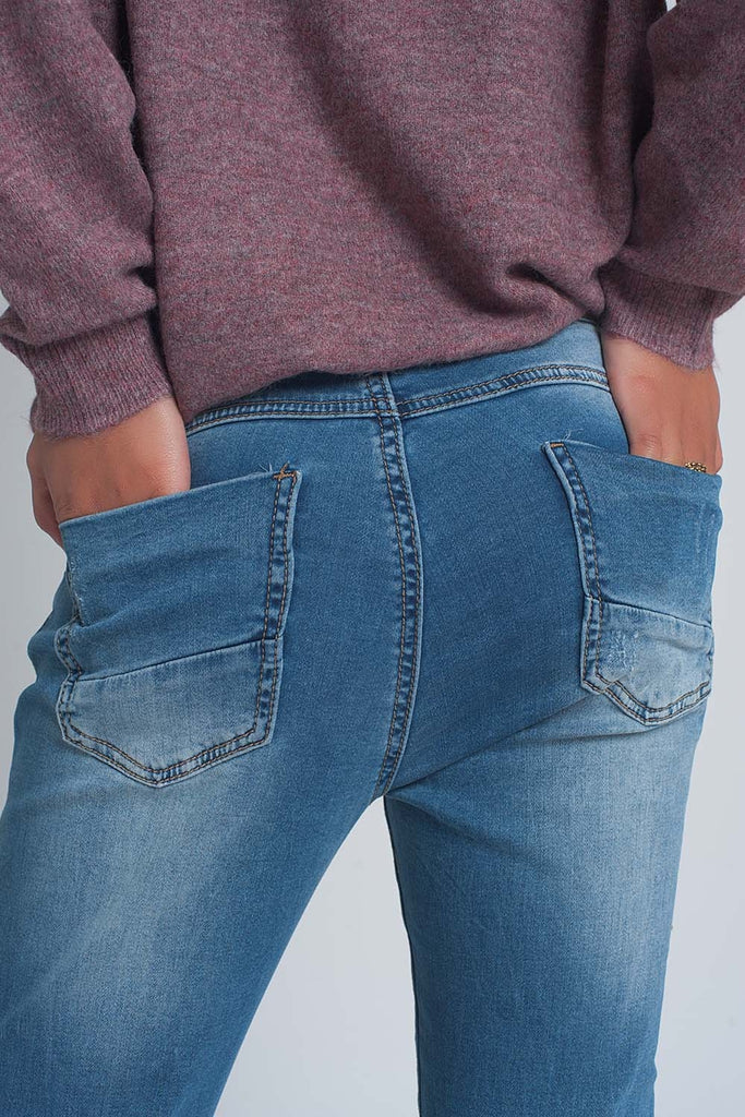 Calças de ganga rasgado em tejido fino no meio da lavagem