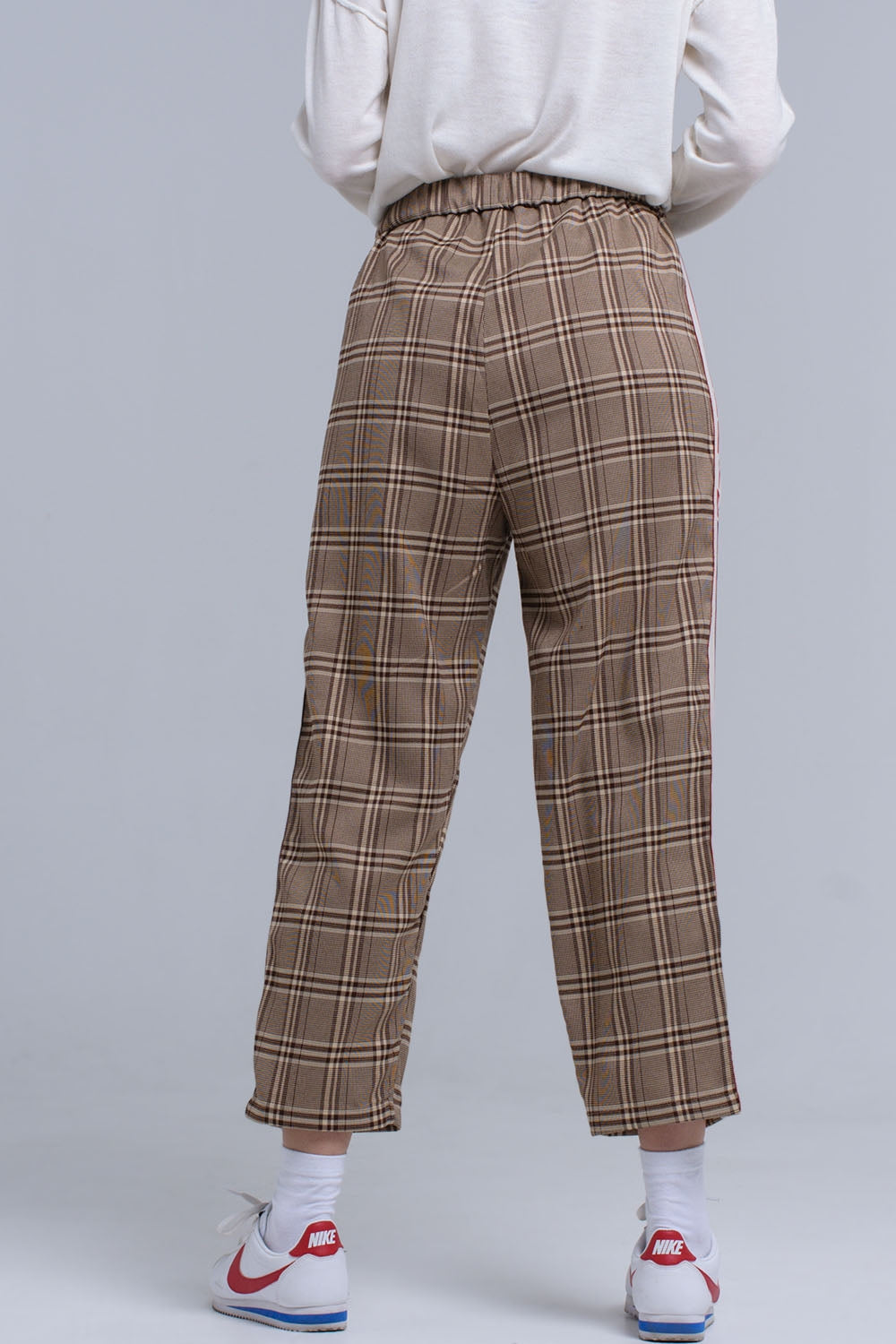 Calças de padrão tartan marrom