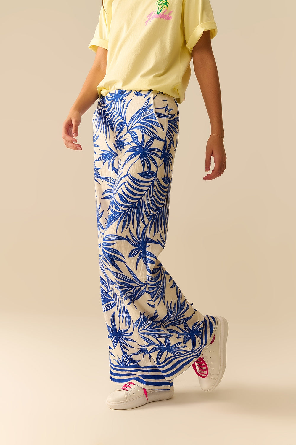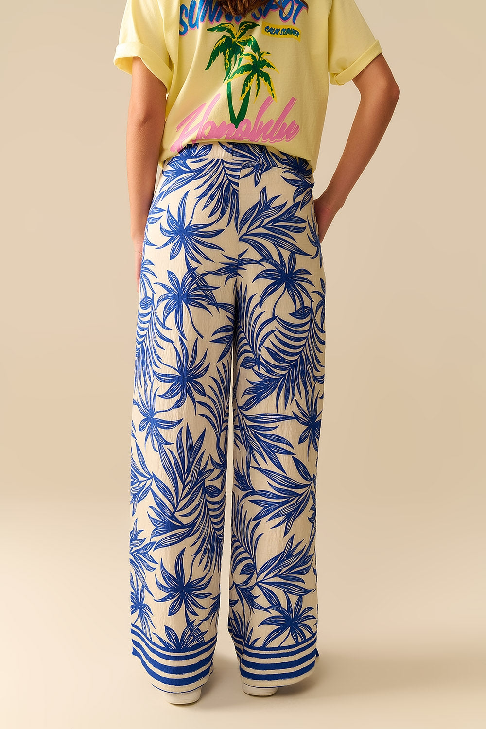 Calças de Perna Larga em Branco com Estampa Tropical em Azul