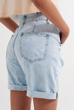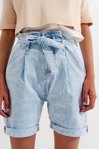 Calções de ganga com lavagem azul clara e gravata de cintura