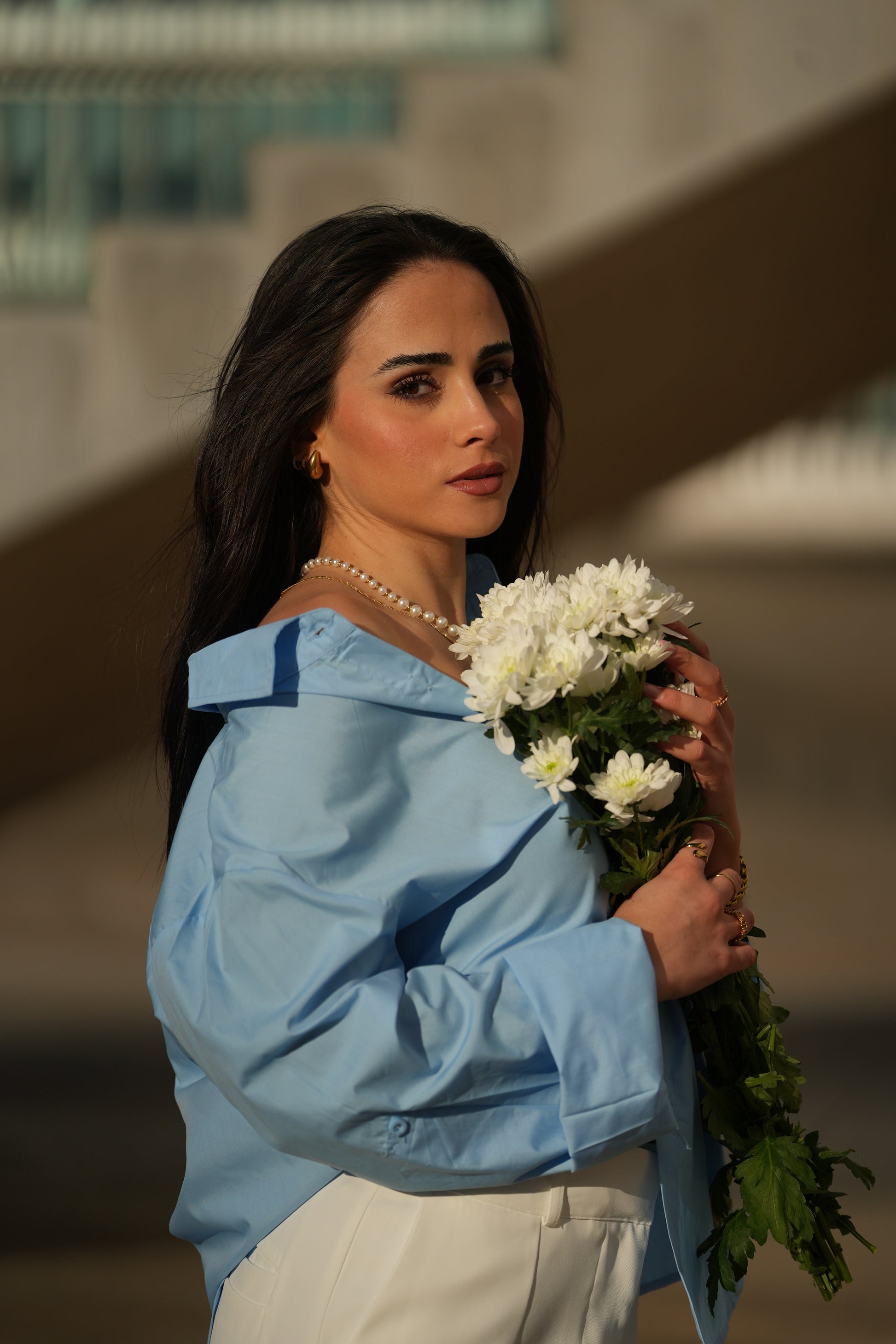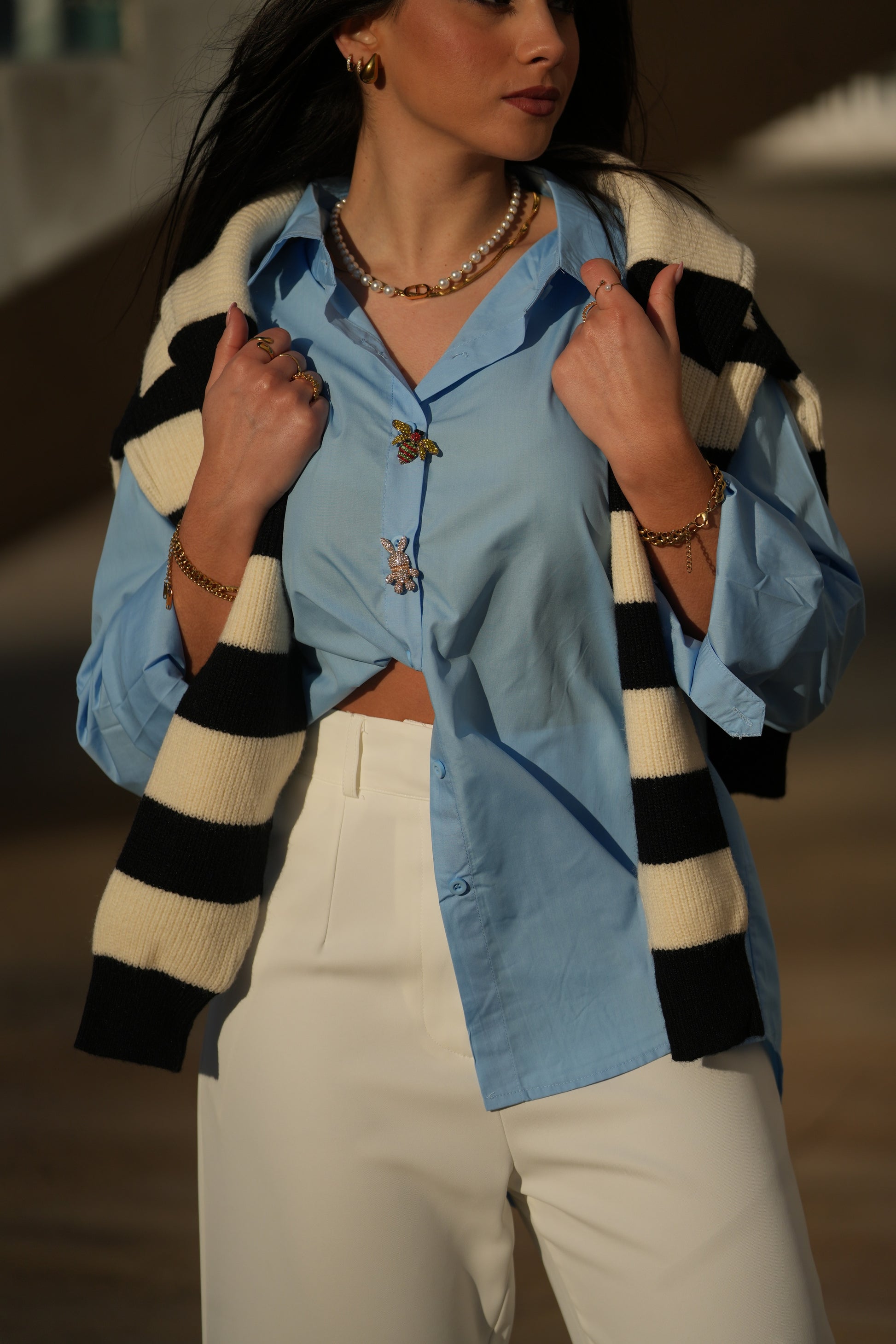 Camisa de manga comprida, punho com botão. Colarinho de pontas. Fecho frontal com botões. Possibilidade de colocar meia manga através de presilha e botão.