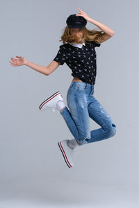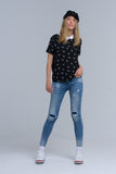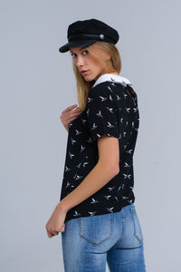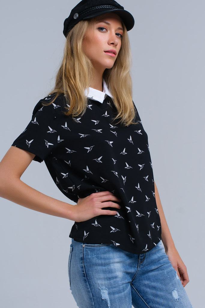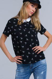 Camisa preta com pássaros impressos brancos