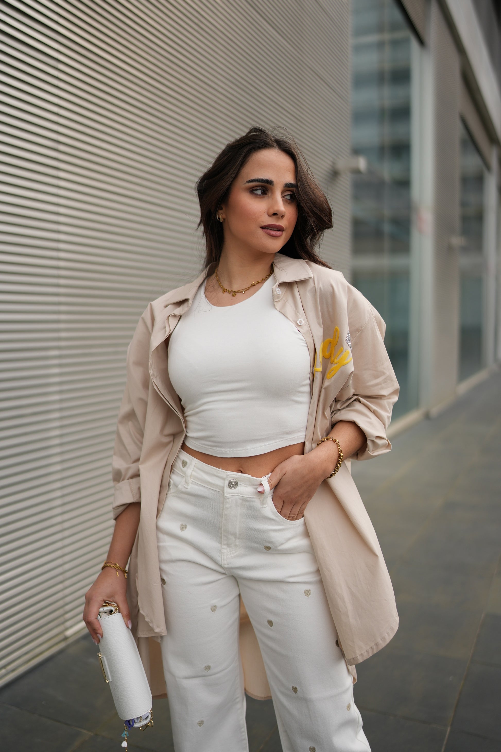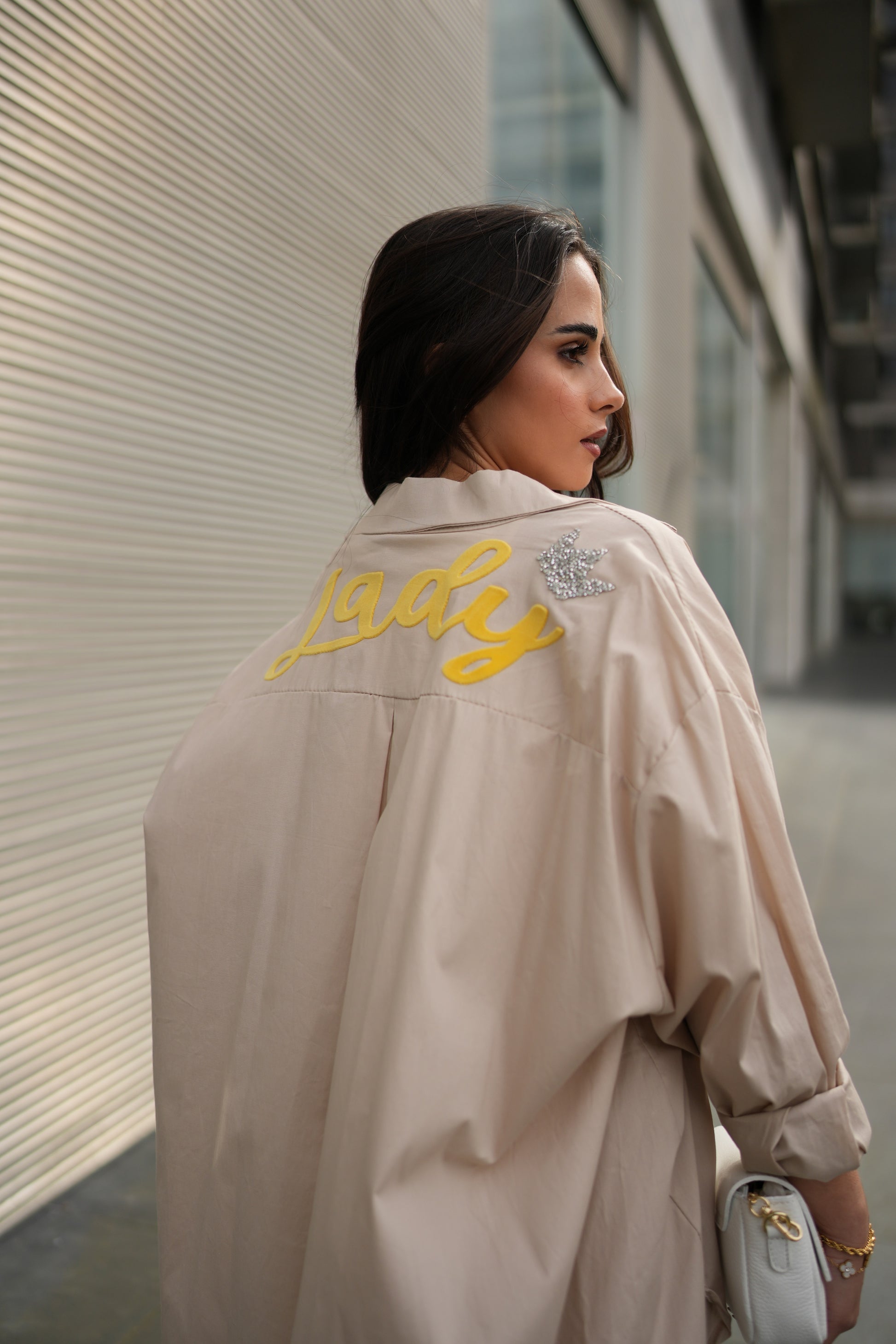 Camiseiro oversize de manga comprida que termina com botão. Palavra "Lady" na côr amarelo em relevo e pormenor de desenho de uma coroa em brilhantes à frente e atrás. Mais comprido atrás.