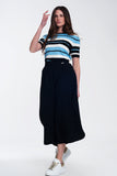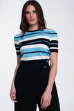 Camisola azul multicolorida de corte quadrado às riscas de pescoço redondo