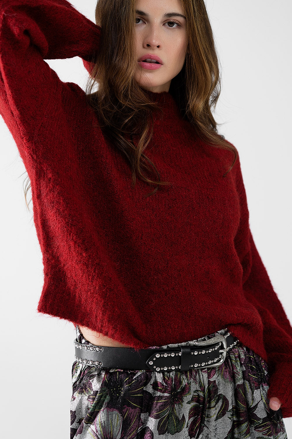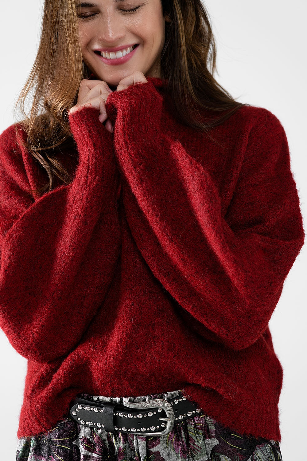 Camisola vermelha felpuda com gola alta e mangas em balão
