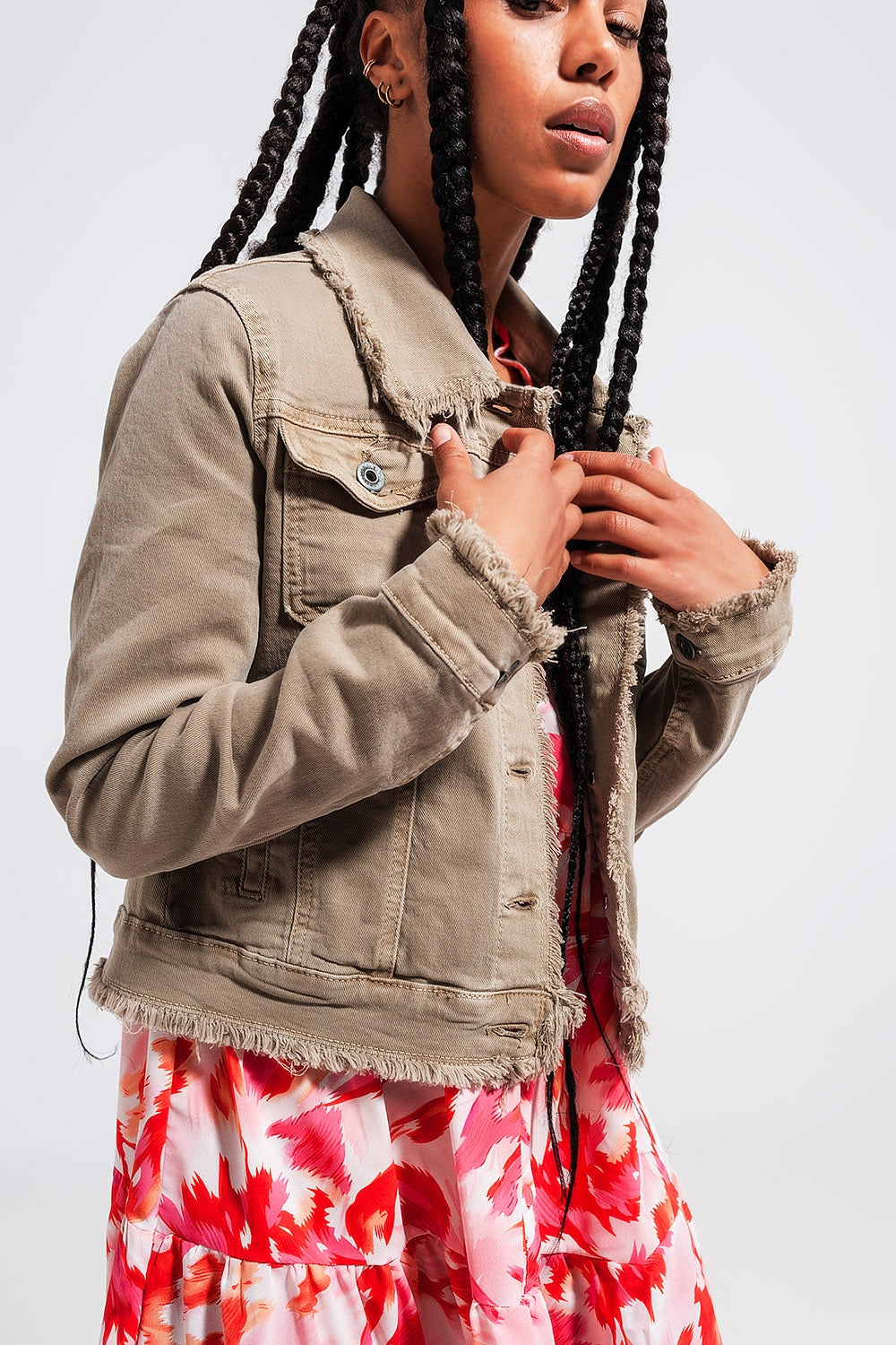 Casaco de ganga cinzento com bordas em bruto
