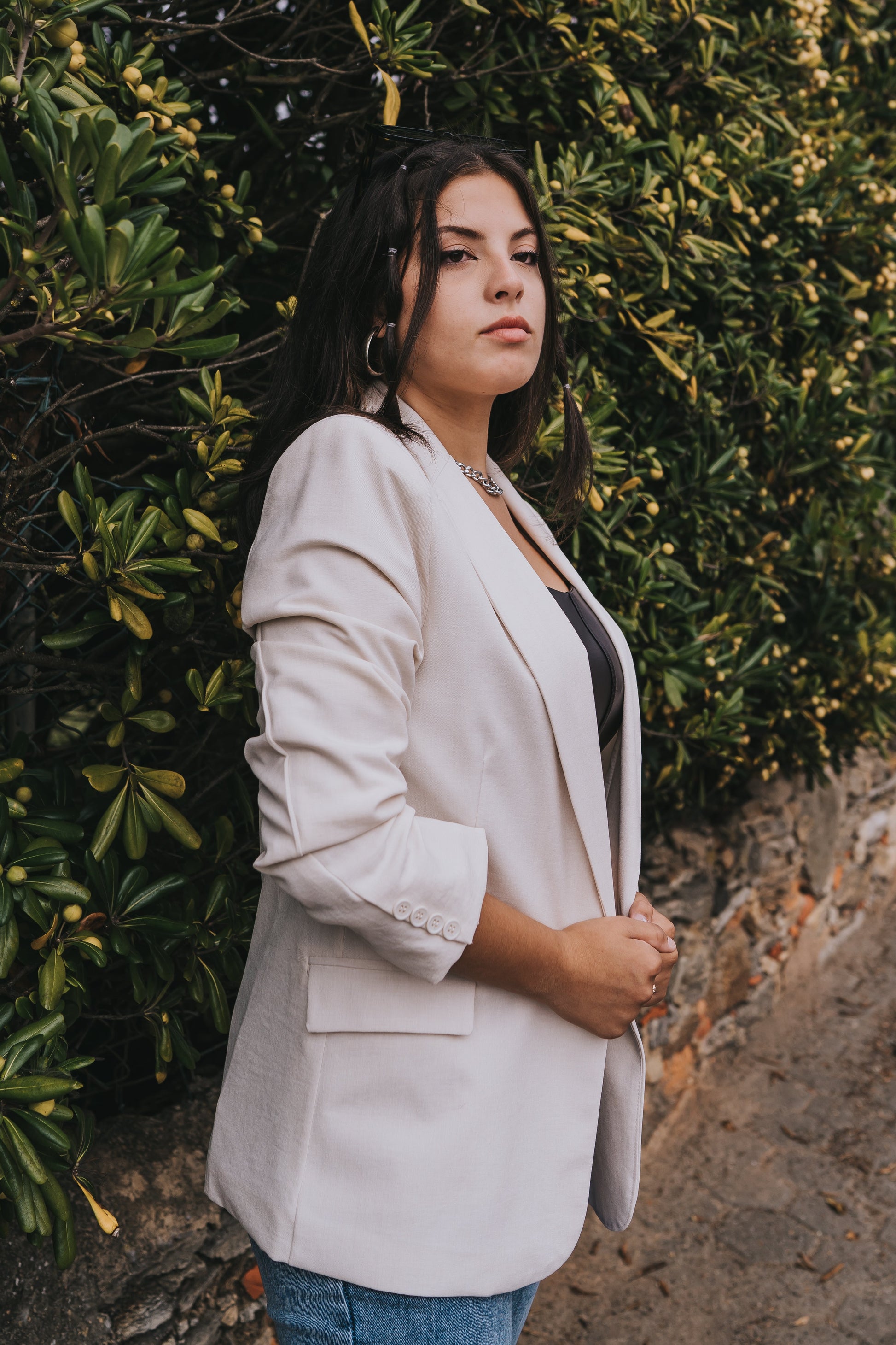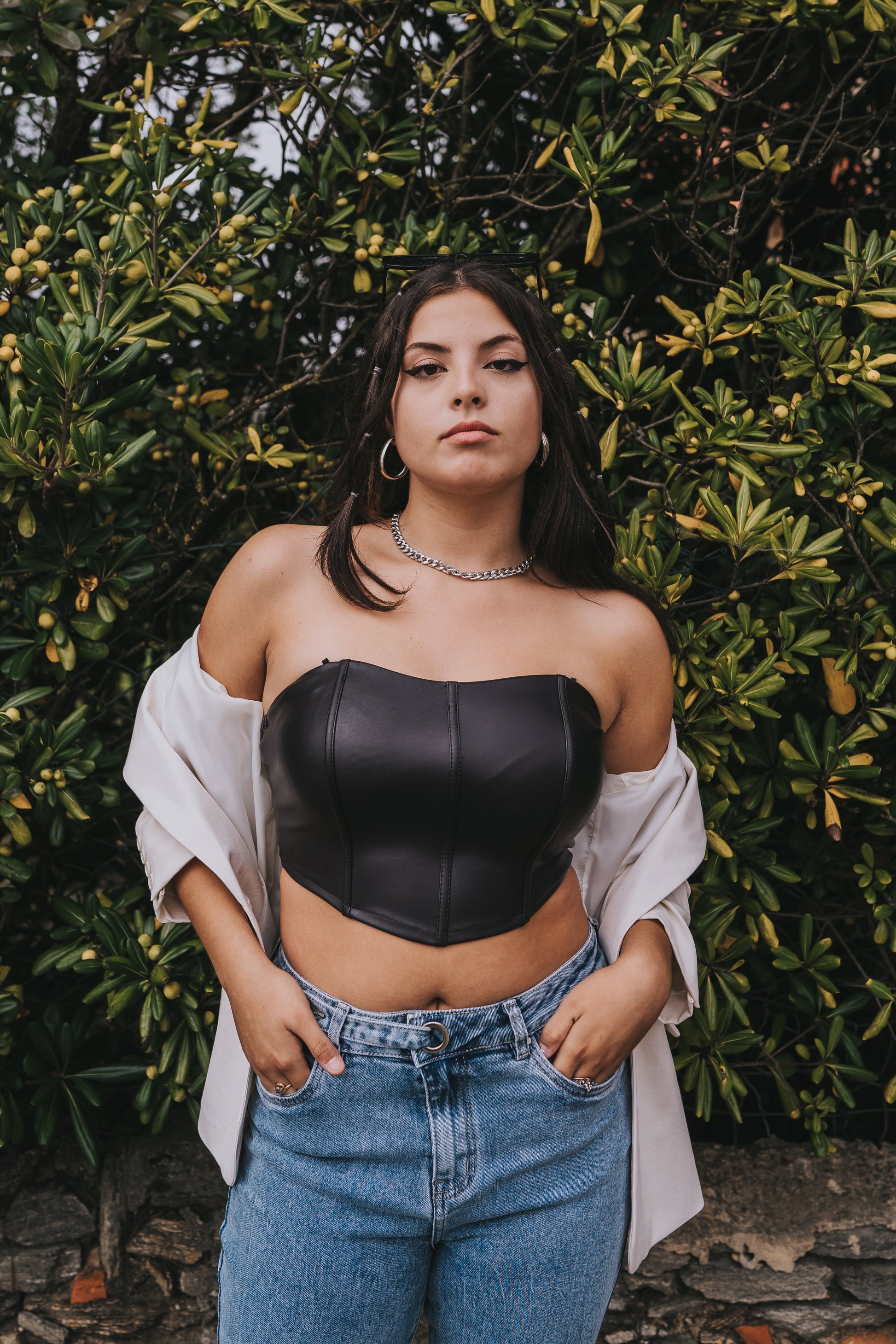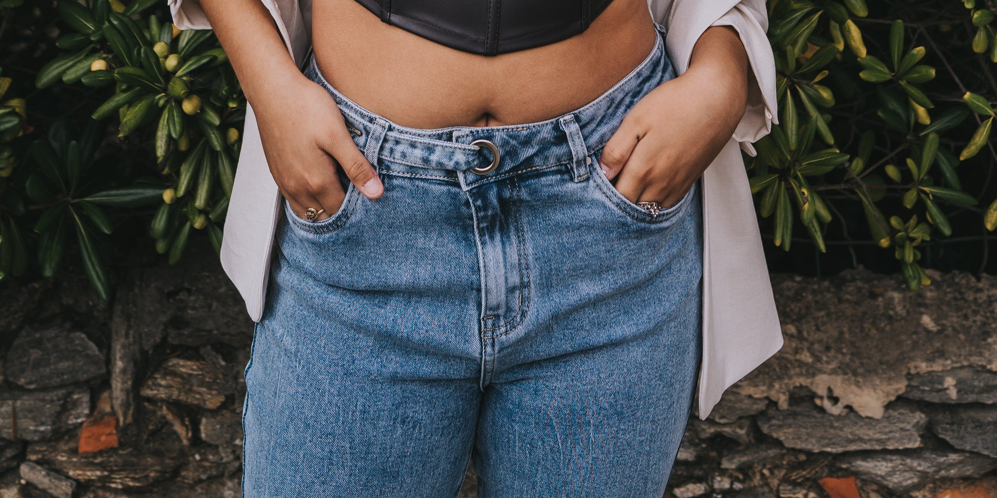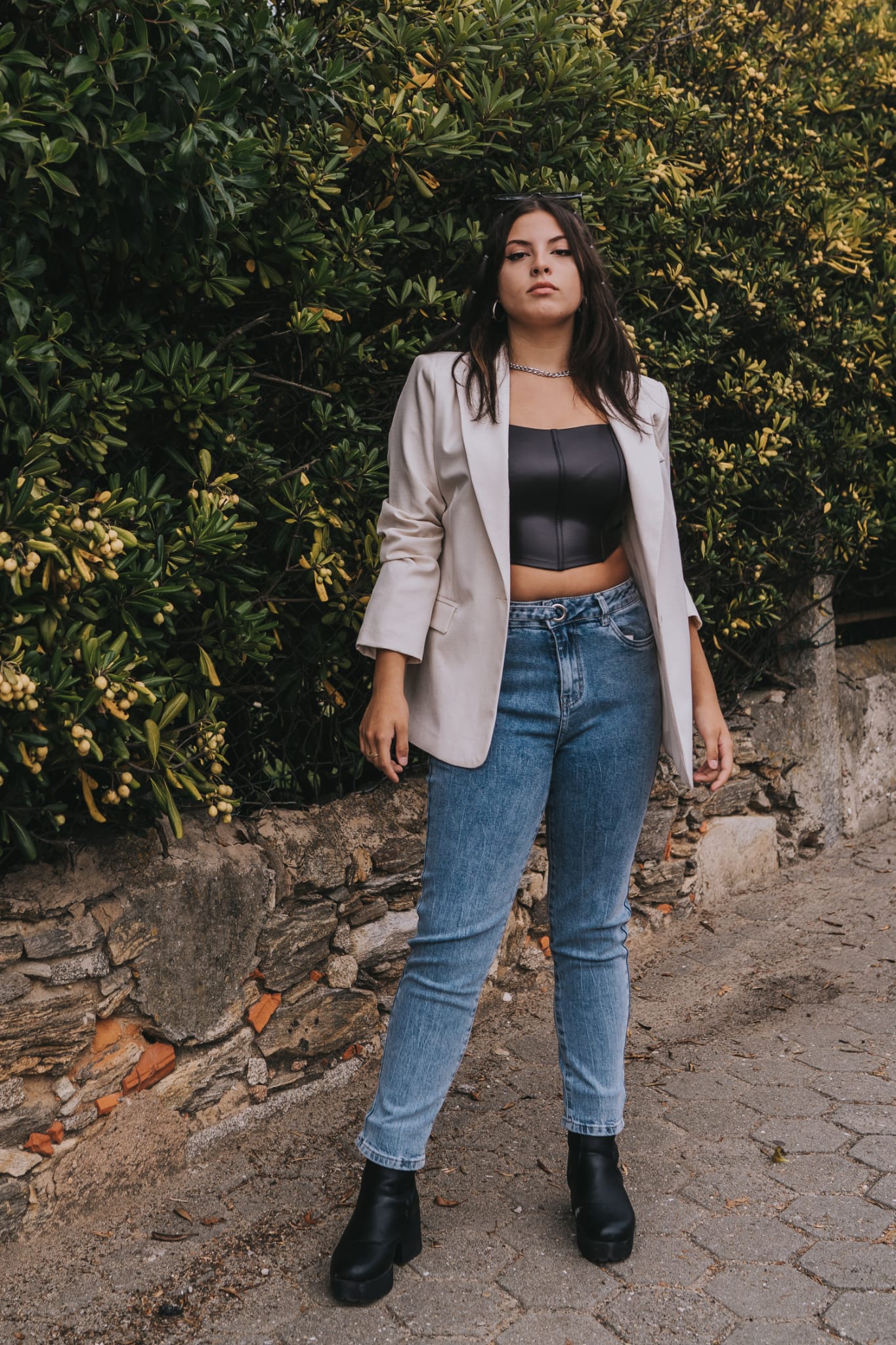 Conjunto composto pelo Blazer Catherine, o Corpete polipele Adele a os jeans mom fit "Queen Hearts".