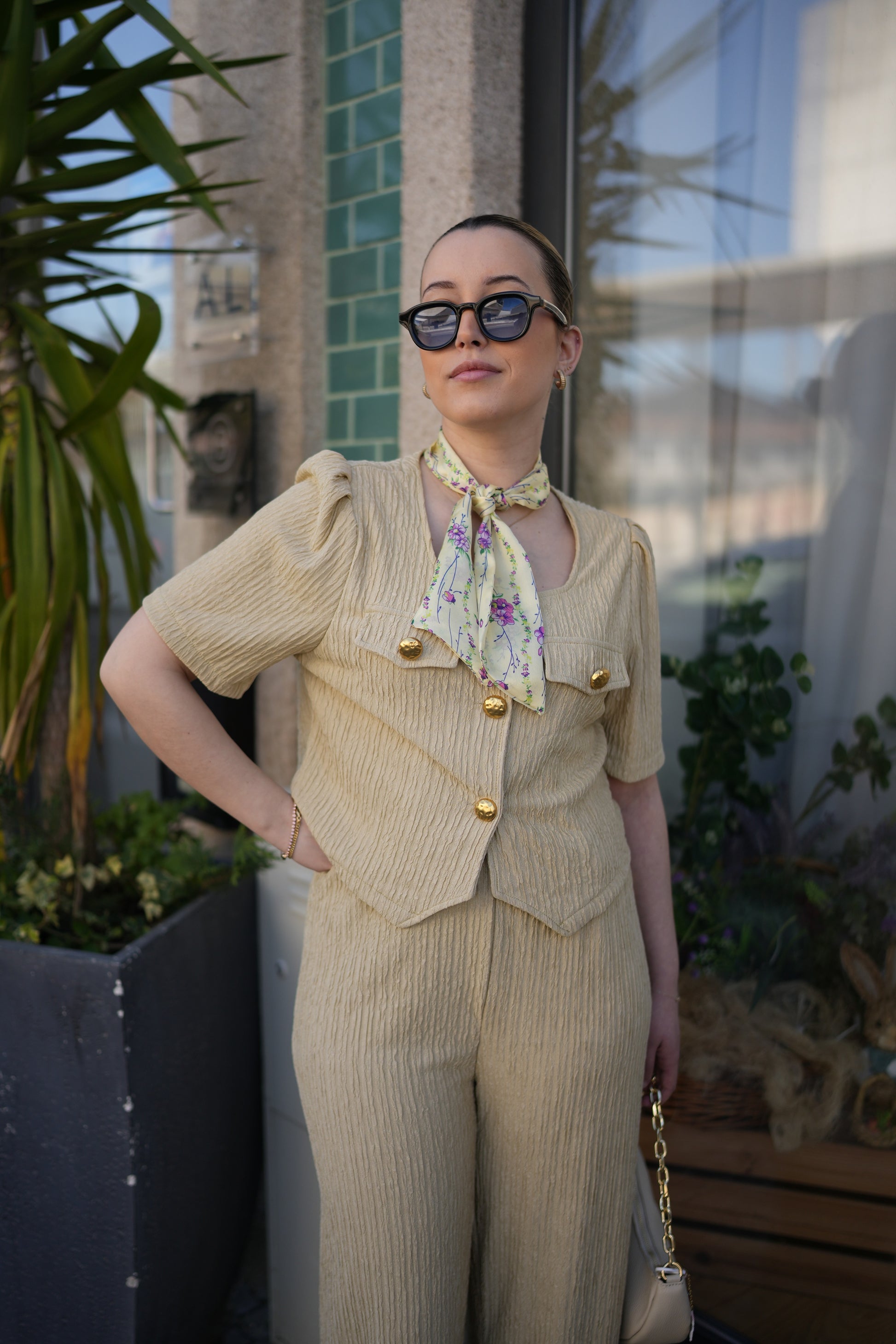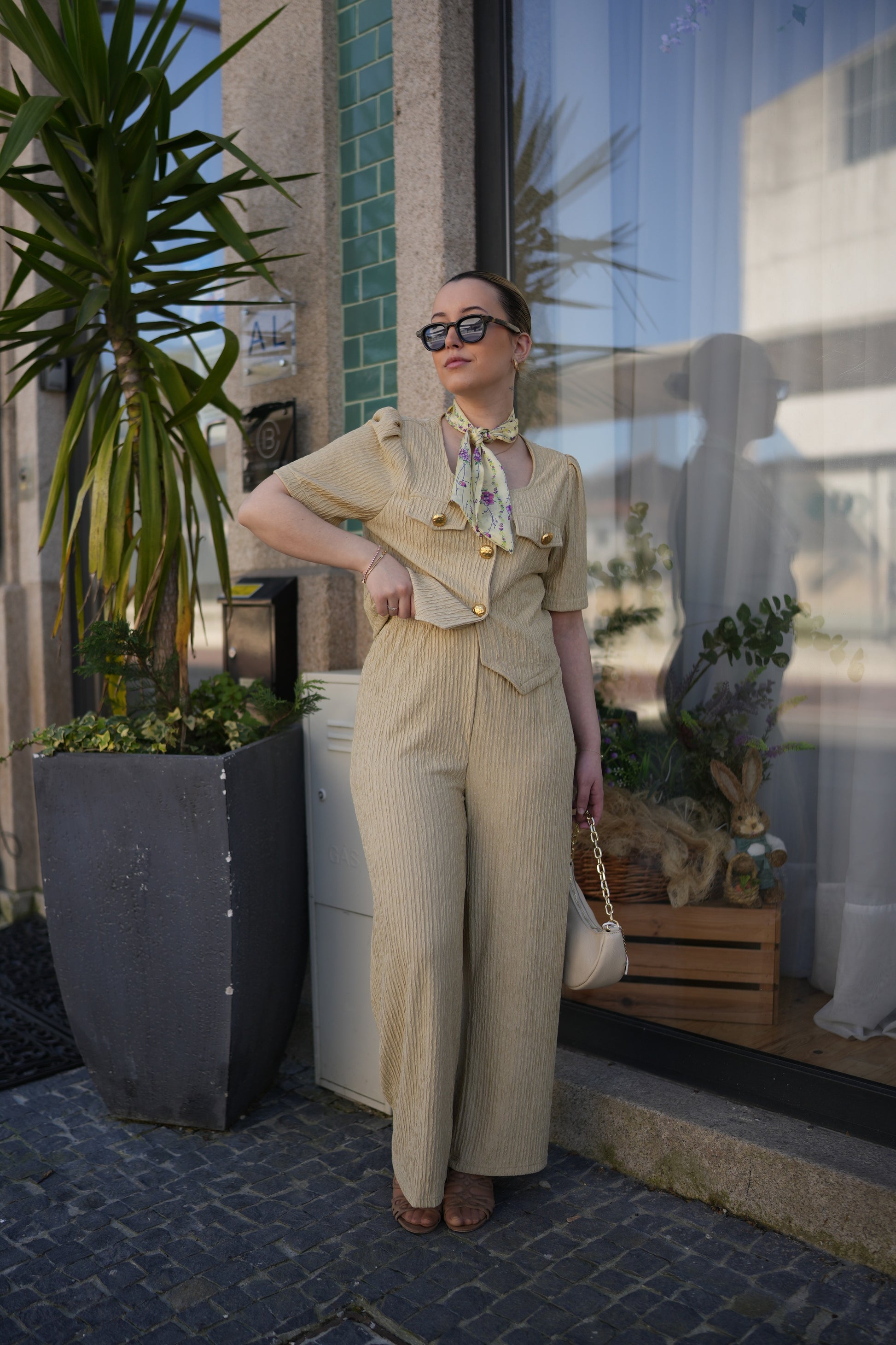 Conjunto constituído por top de manga curta que fecha com botões dourados na frente e calça.