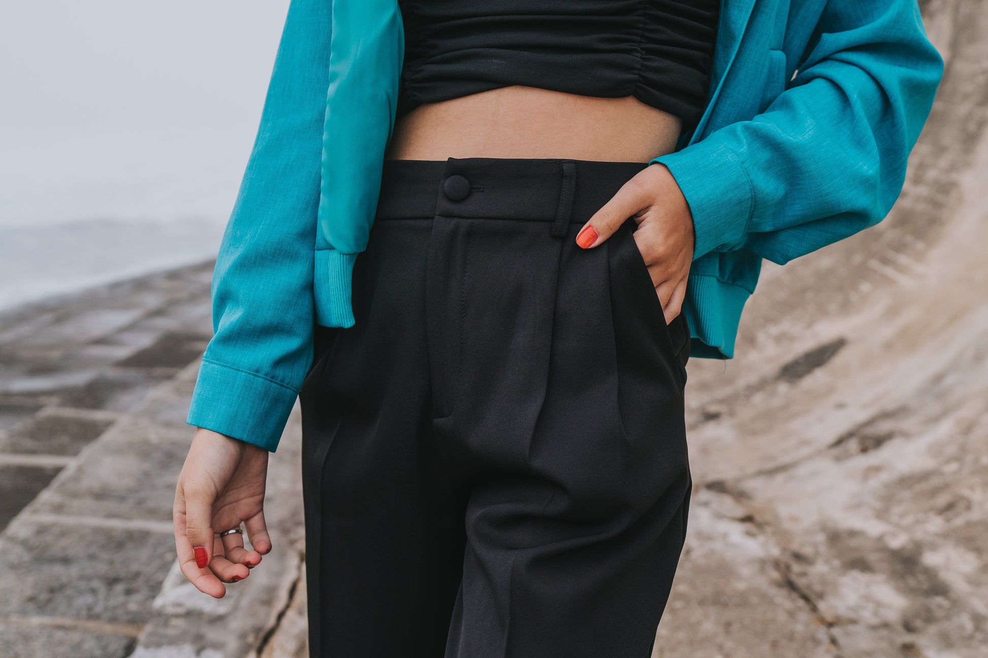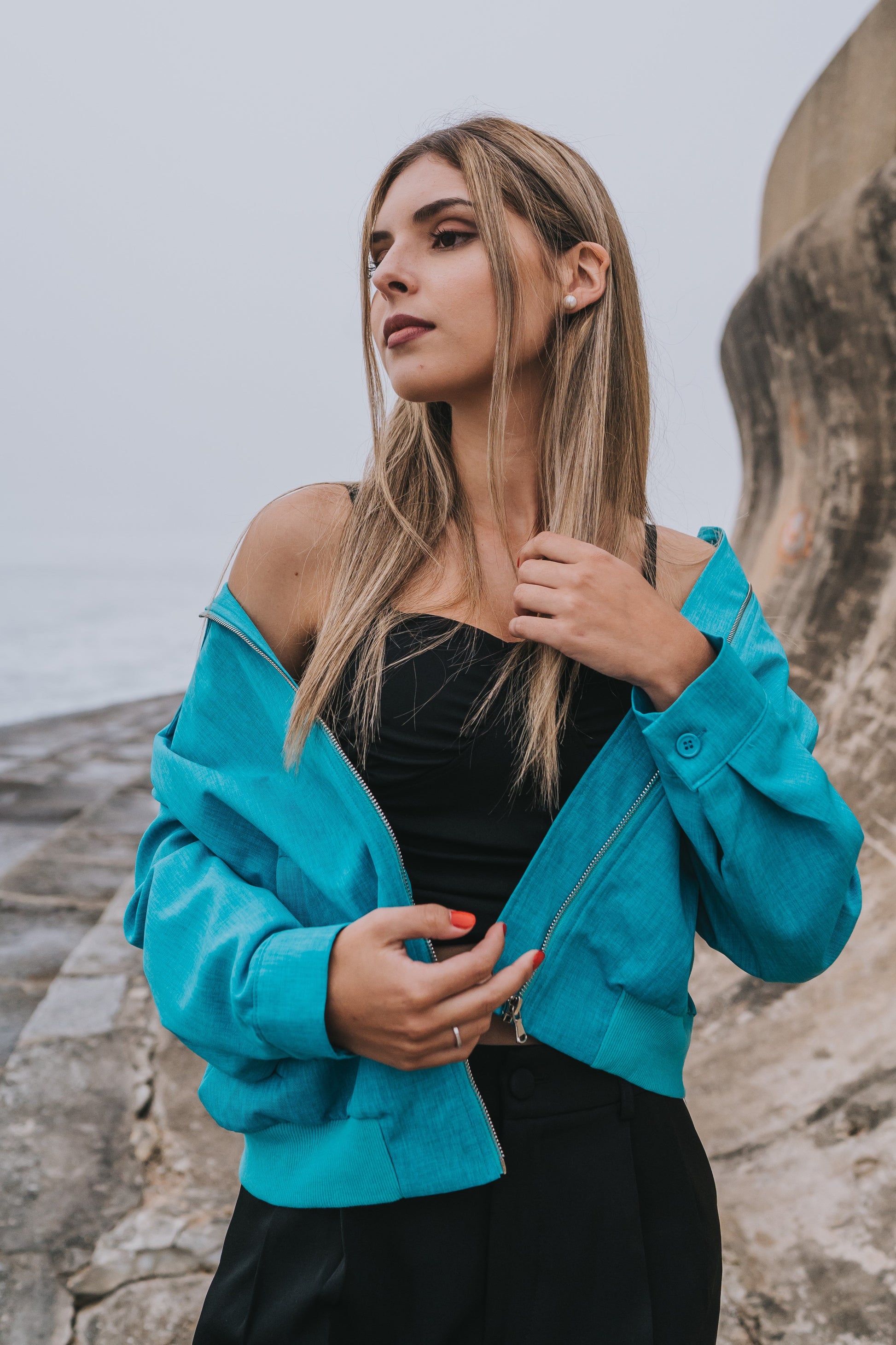 Conjunto composto por 3 peças: blusão Seaview, top preto Camila e calça Elegance.