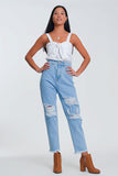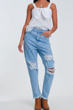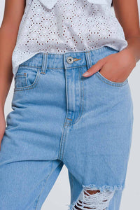 Jeans azul claro de cintura alta com rasgos nos joelhos