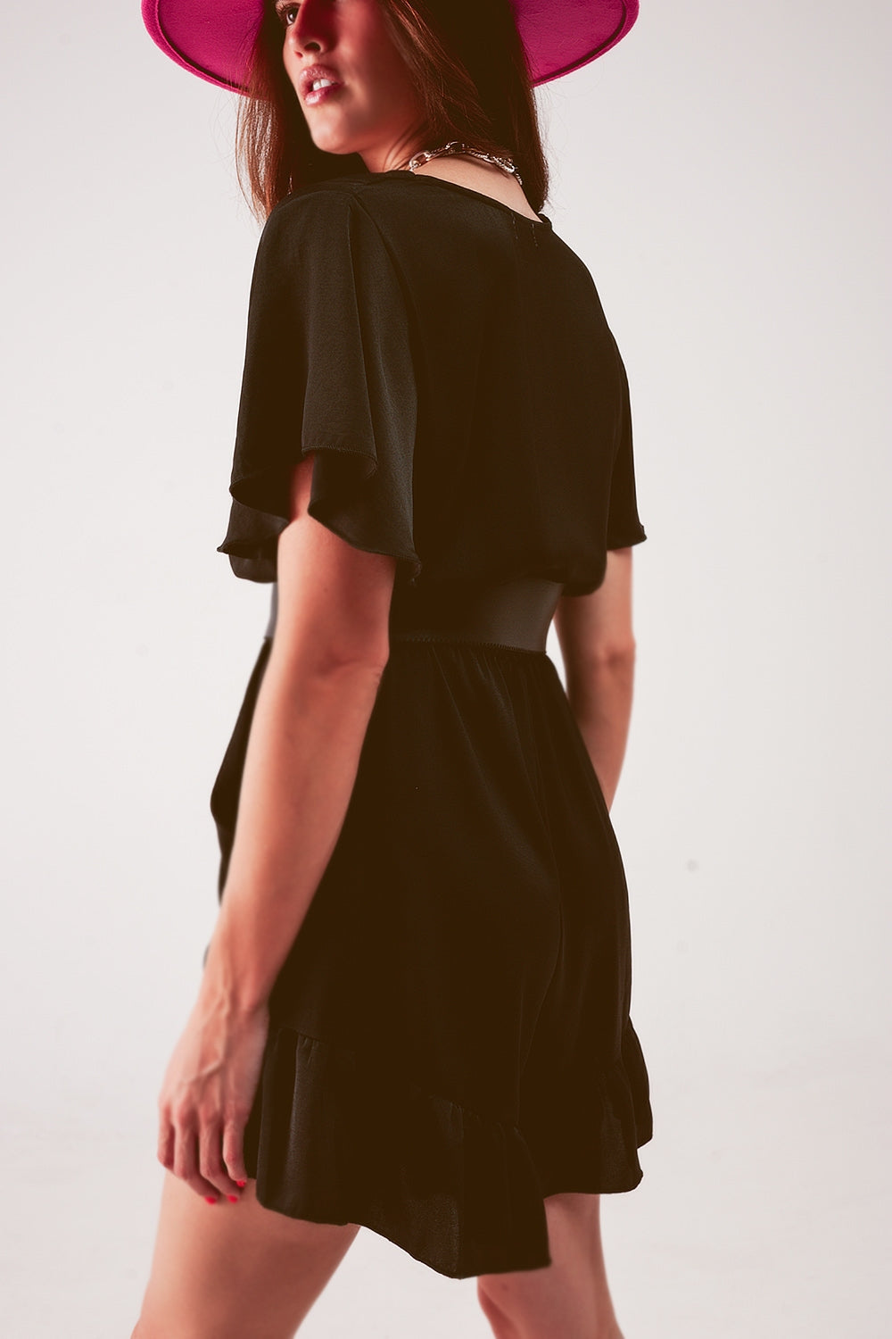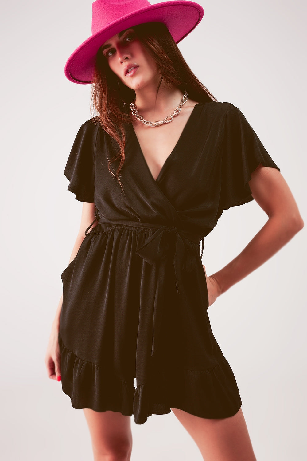 bolsos: Bolsos laterais. Bordadura: Com rufos na bainha. Cintura : Cintura elástica. colarinho: Pescoço em V. comprimento: Corte curto. Cortam: Com cobertura frontal. detalhe: Cinto do mesmo tecido incluído. Detalhes do produto: Bolsos funcionais. estilo: Romantic. Fechamento : Fecho por laços . Mangas: Mangas de anjo. Subcategoria: Macacão curto. Tecido: Cetim. runs true to size. S.