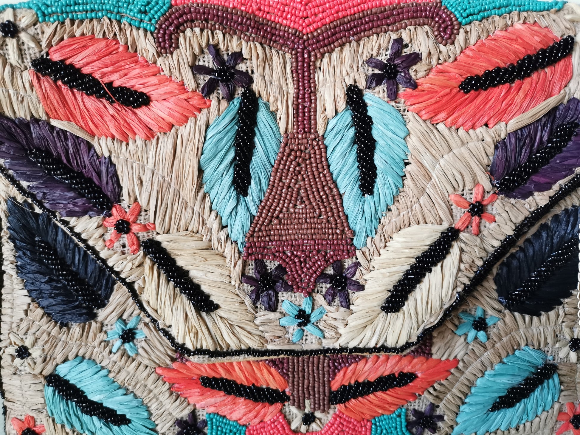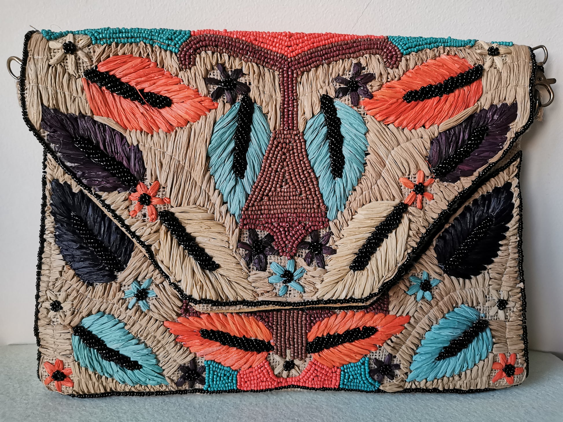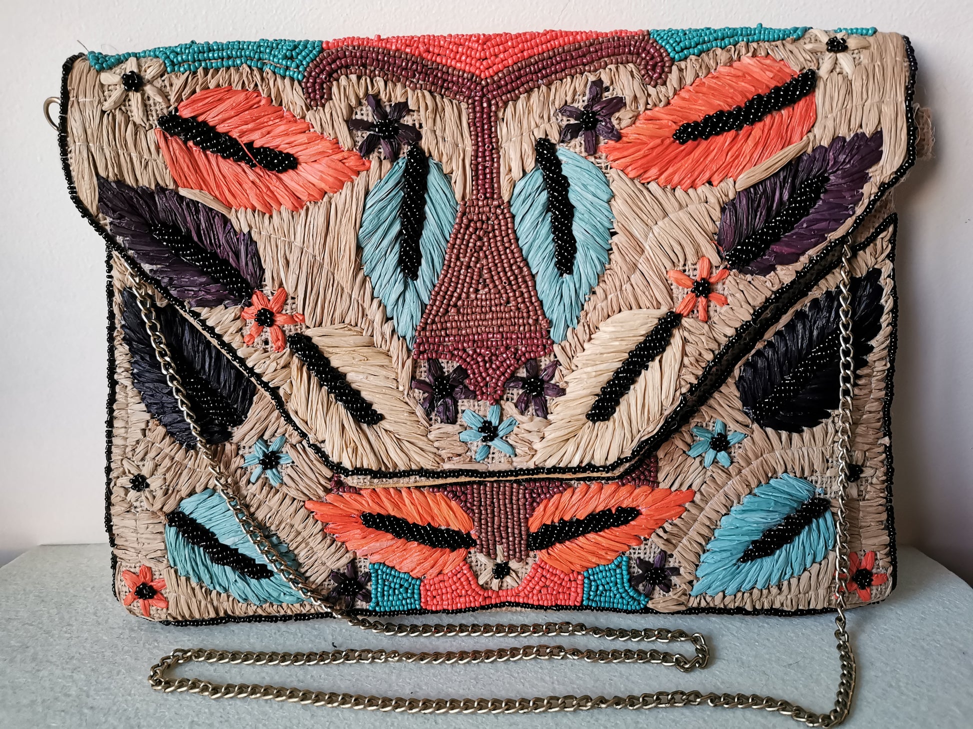 Mala em ráfia com missangas. Forrada. Fecho de mola. Bolso interior. Alça de corrente dourada a tira-colo.