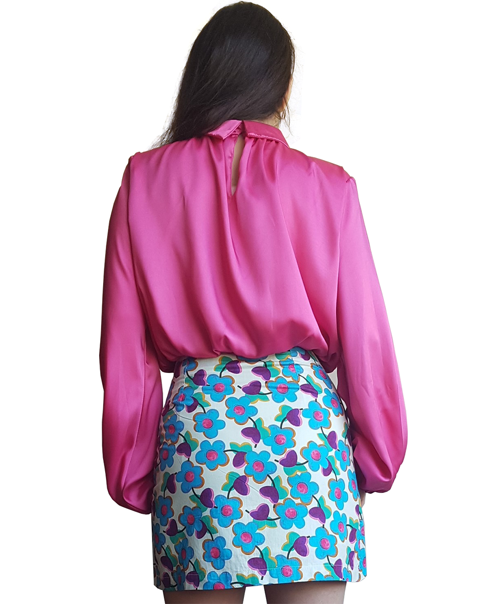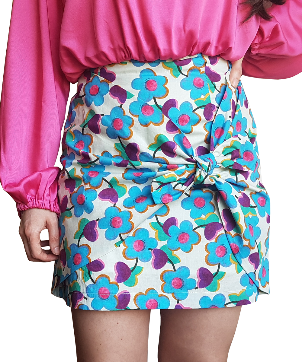Mini-saia com flores. Fecho lateral invisível. Laço à frente.
