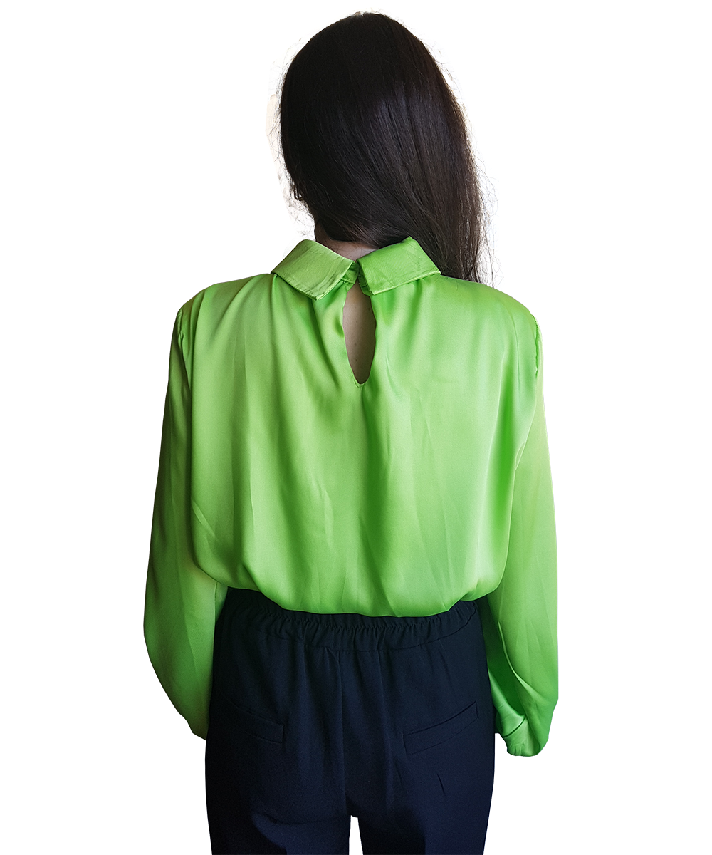 Crop top em cetim, manga comprida. Decote com colarinho. Elástico na cintura e nos punhos.