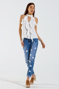 Top branco sem mangas com pormenores em folhos e gola alta