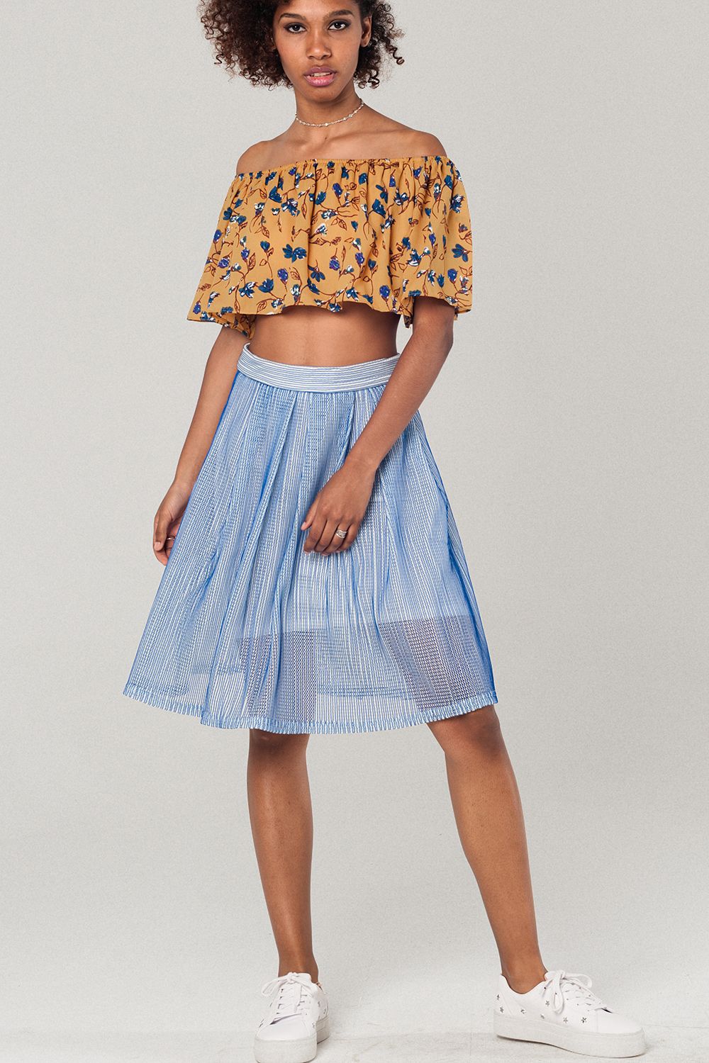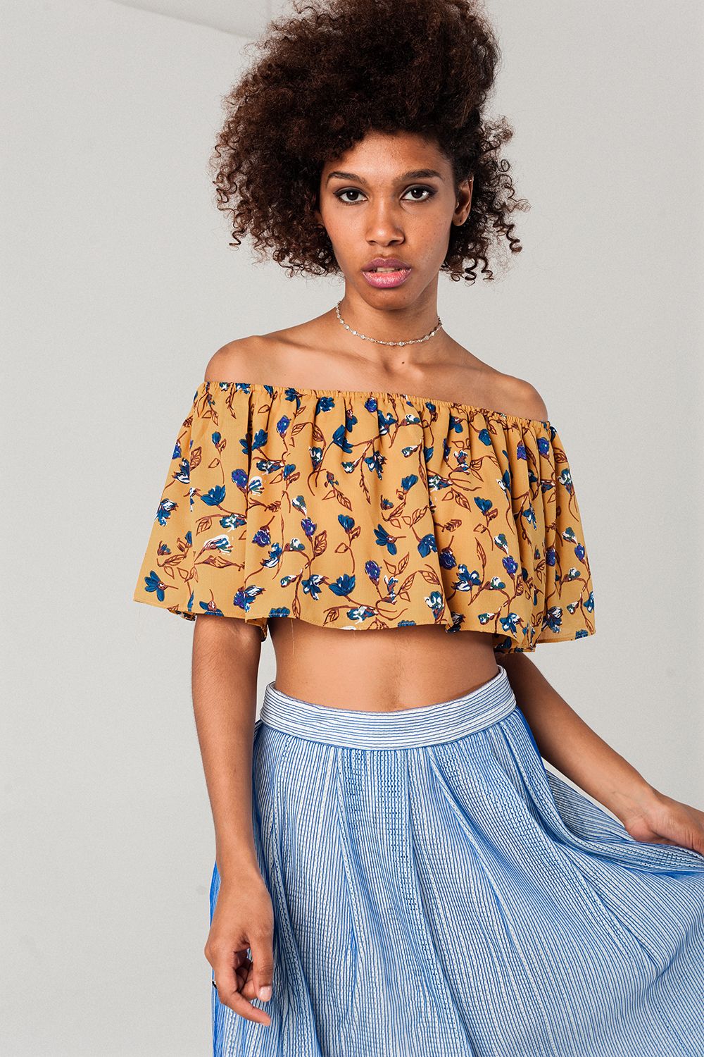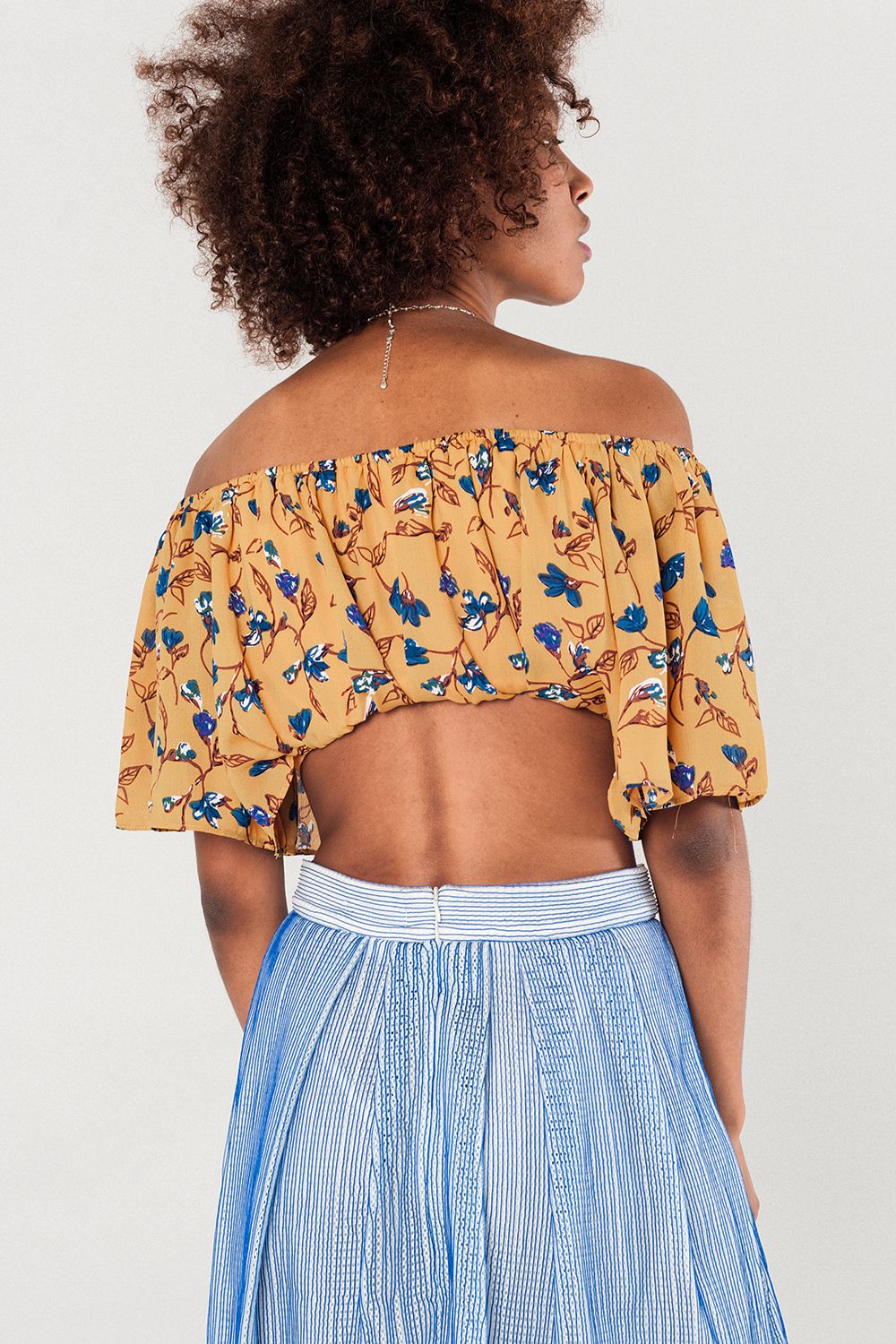 Top curto com ombros descobertos na cor mostarda