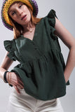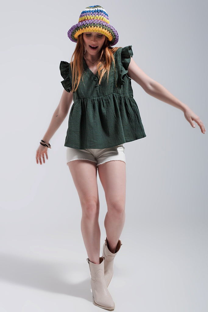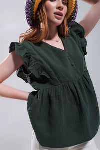 Top de algodão em cáqui com mangas de rufos