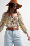 top de manga comprida com cintura shirred e detalhe de gravata em impressão de cachemir