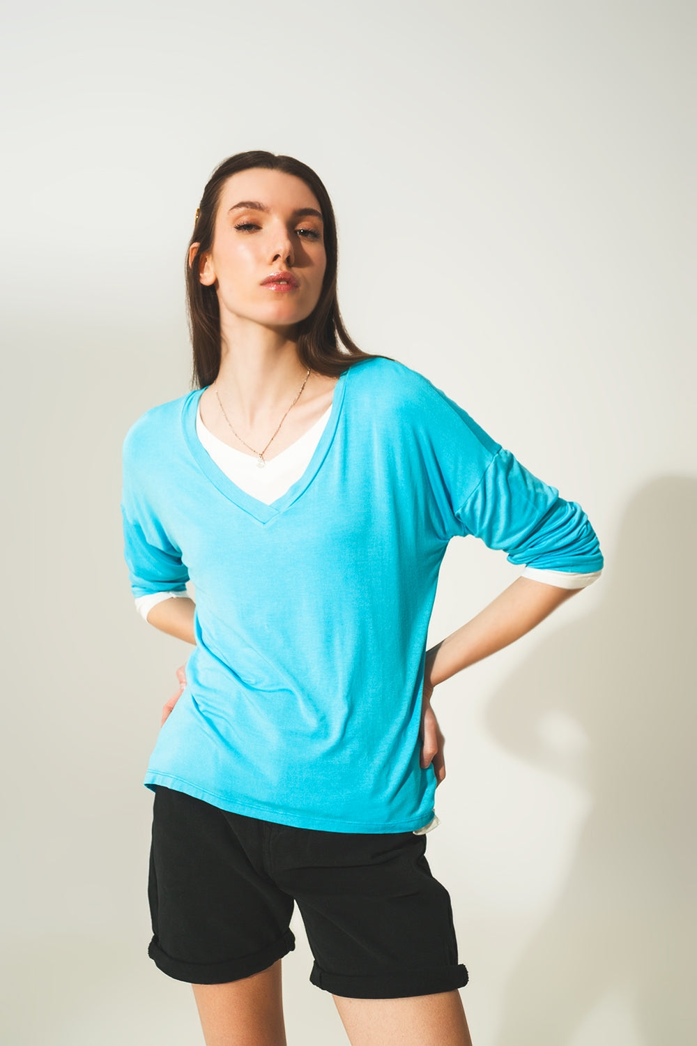 Top de manga comprida em modal azul com decote em V preto